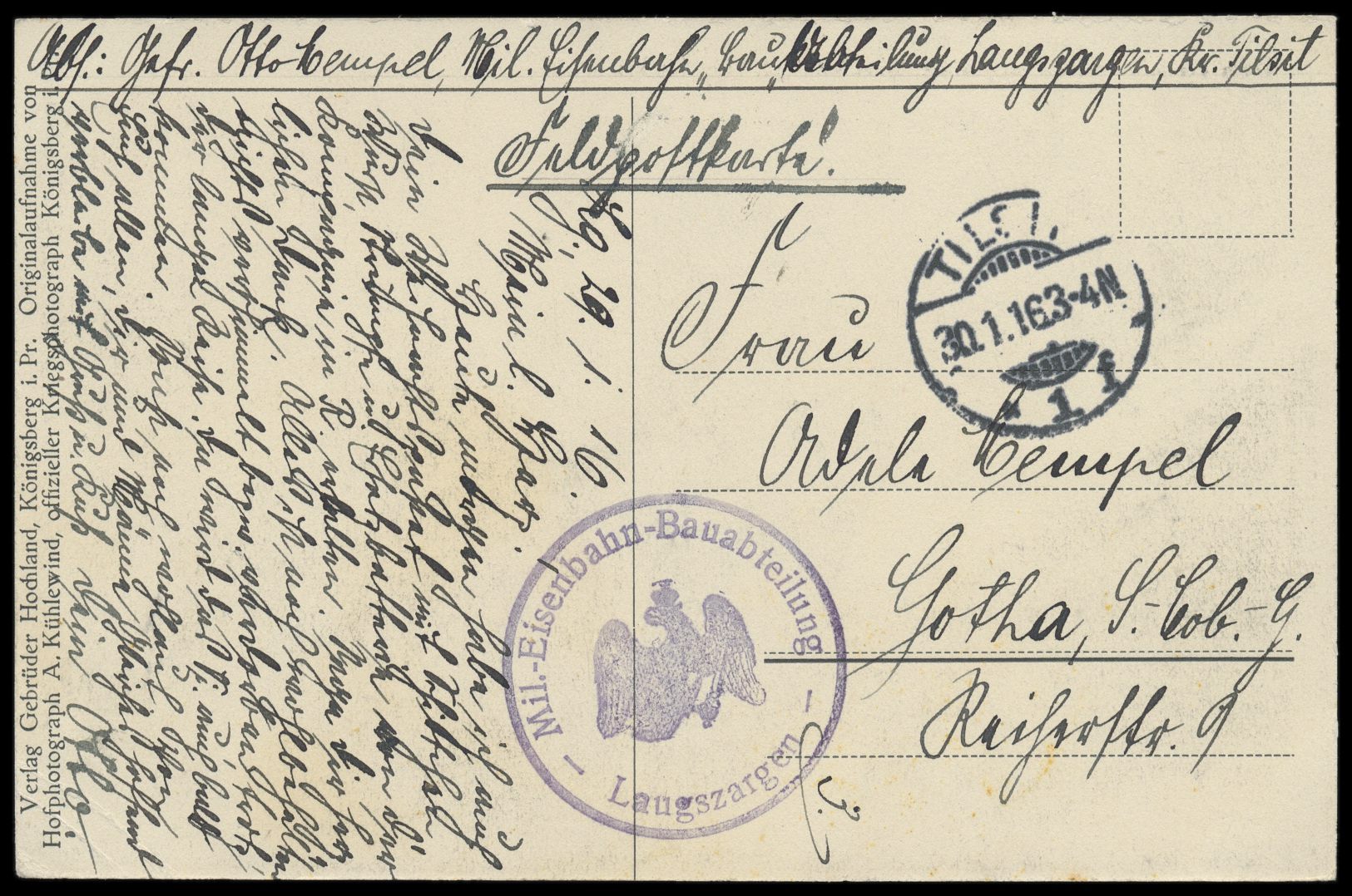 Feldpostkarte (Ansichtskarte Goldap am Markt - Nach der Russenvertreibung aus Ostpreußen 1915) mit Stempel Tilsit 1 30.1.16 nach Gotha, seltener Briefstempel Mil.-Eisenbahn-Bauabteilung Laugszargen, Bedarf