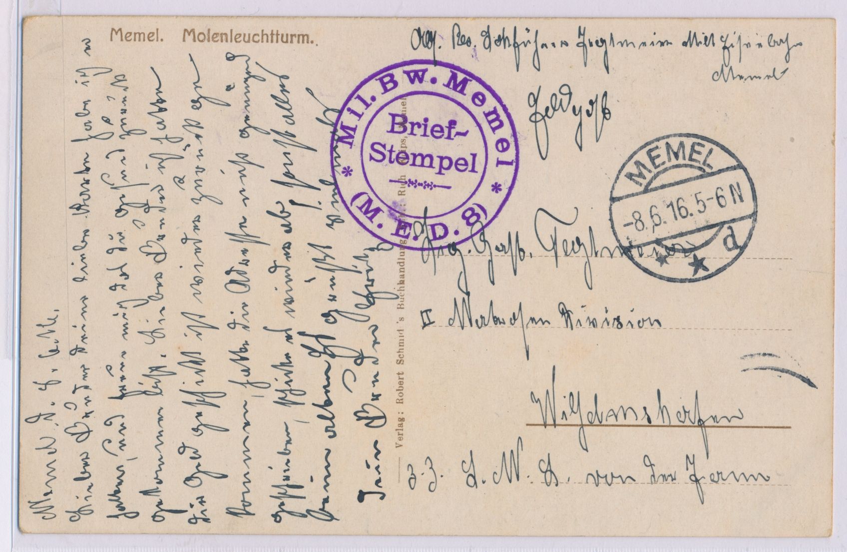 Stempel Memel d 8.6.16 und Briefstempel Mil. Bw. Memel (M.E.D.8) auf Feldpostkarte (Ansicht Molenleuchtturm) an S.M.S. v. d. Tann in Wilhelmshaven, Bedarf