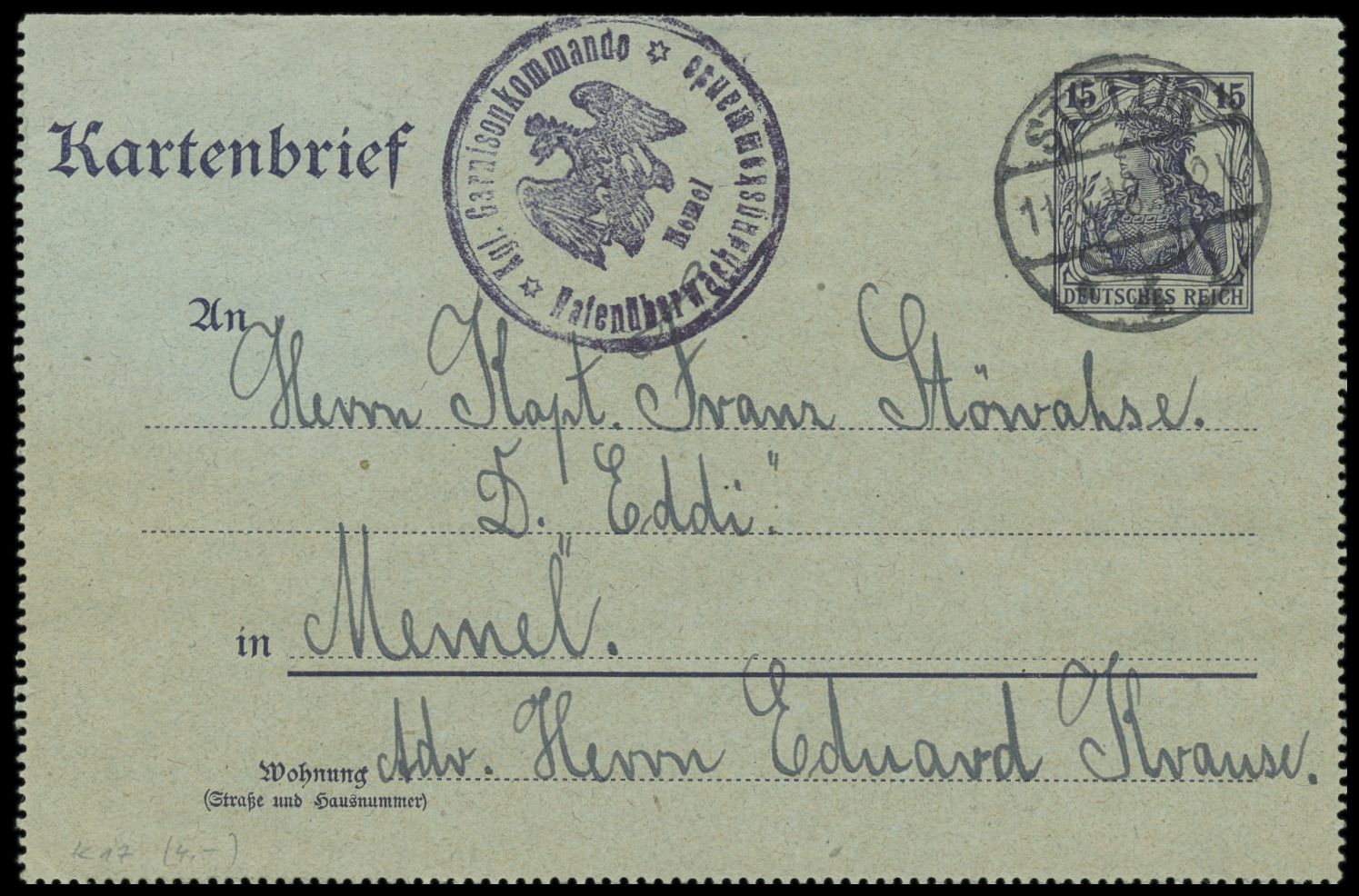 Ganzsachen-Kartenbrief 15 Pf. mit Stempel Stettin 1 11.3.18 an den Kapitän des Dampfers Eddi in Memel, seltener viol. Zensurstempel Kgl. Garnisonskommando / Hafenüberwachungskommando / Memel, Bedarf