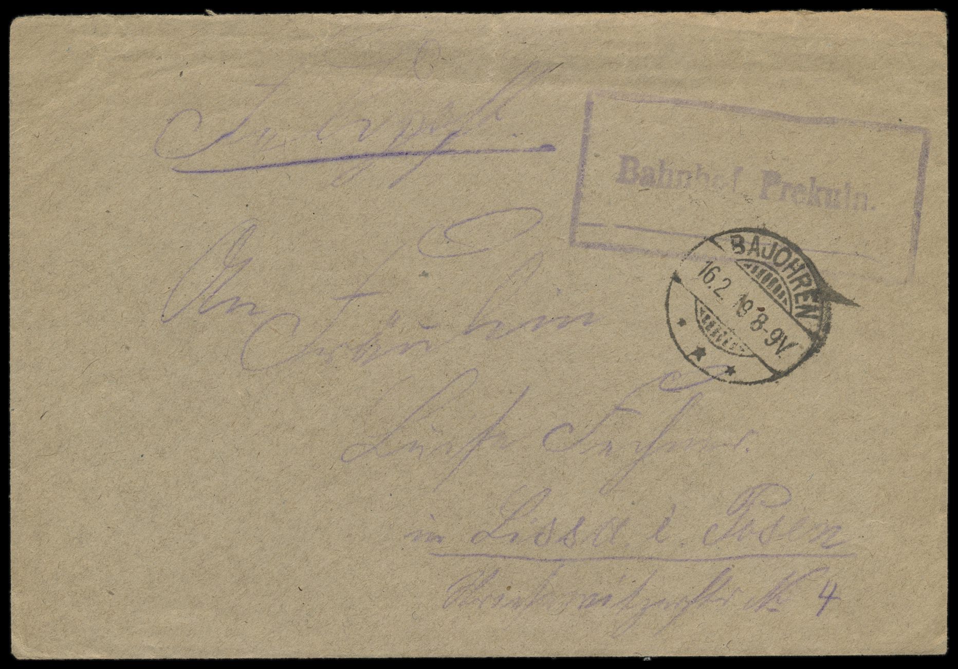 Stempel Bajohren 16.2.19 und seltener viol. R2 Bahnhof Prekuln / ... auf Feldpostbrief nach Lissa i. Posen, handschriftlicher Absender ... Feldpost 383