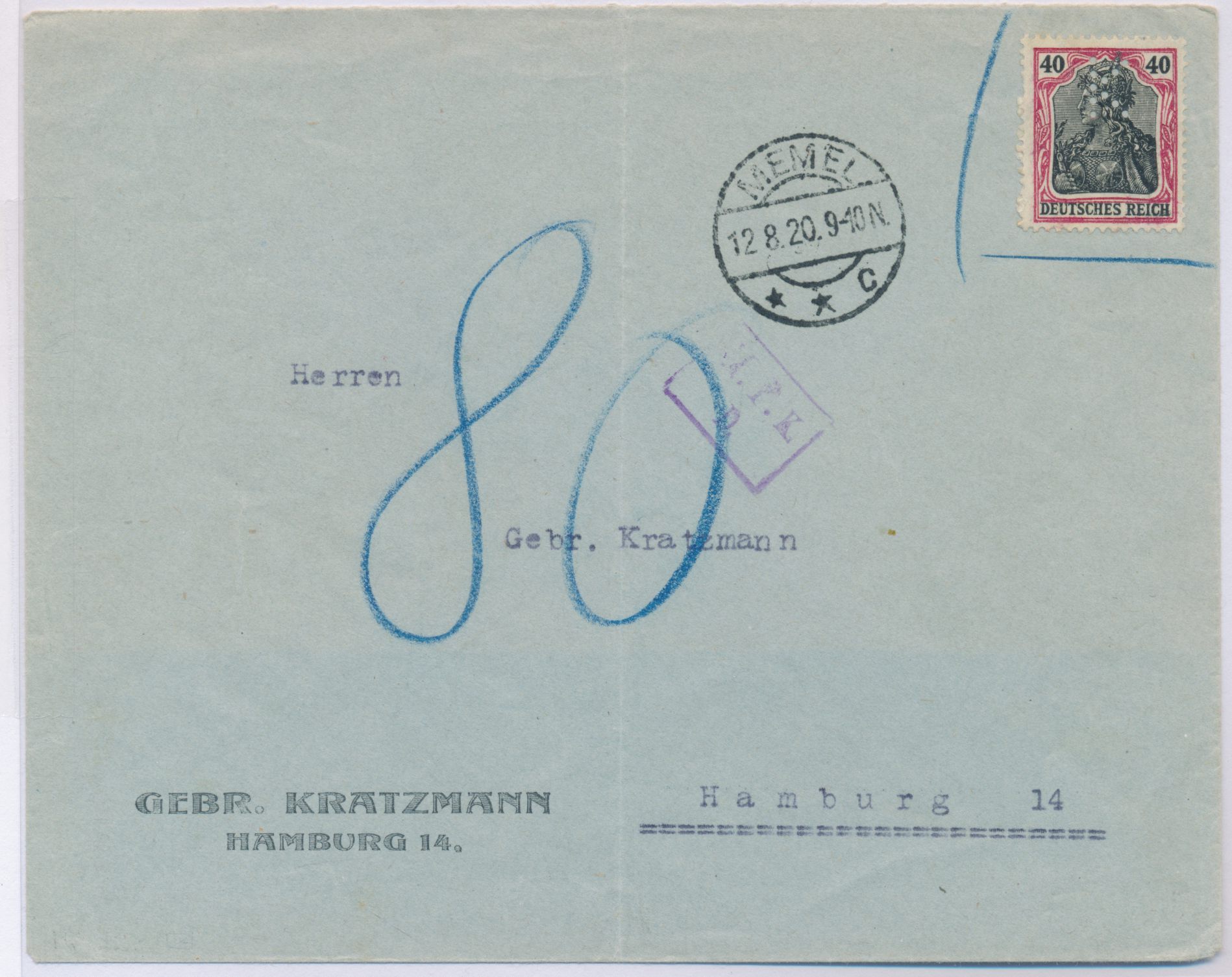 mit 40 Pf. Germania (Firmenlochung "K") vorausfrankierter Rückumschlag (senkrechter Mittelbug) nach Hamburg, Frankatur nicht anerkannt, Stempel Memel 12.8.20 neben blau eingerahmter Marke, handschriftlich Nachgebühr 80 Pf., violetter Zensurstempel M.P.K. / D., Bedarf