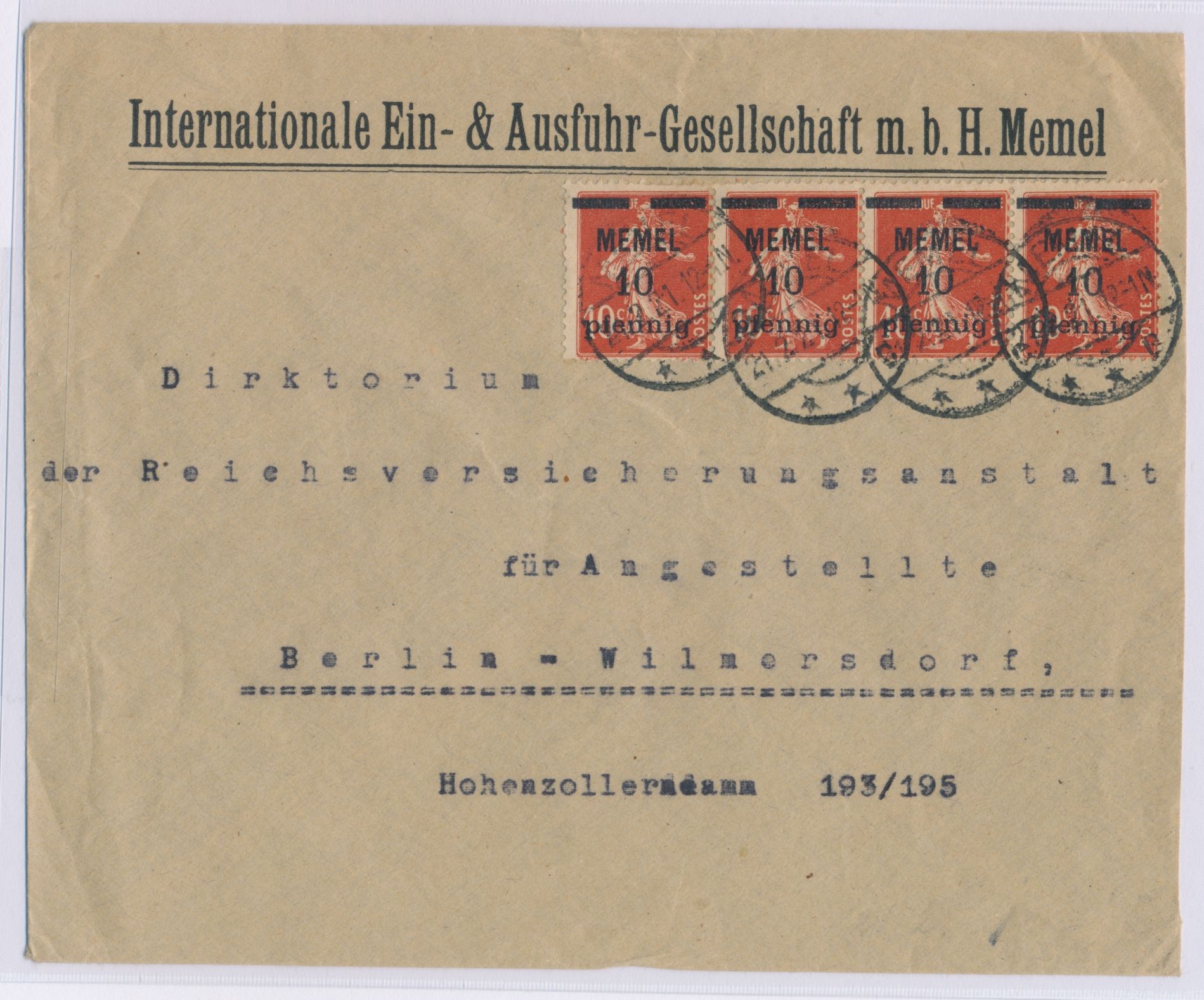 4 x 10 pf. auf 10 C. auf Firmenbrief nach Berlin, Stempel Memel 21.2.21, Bedarf