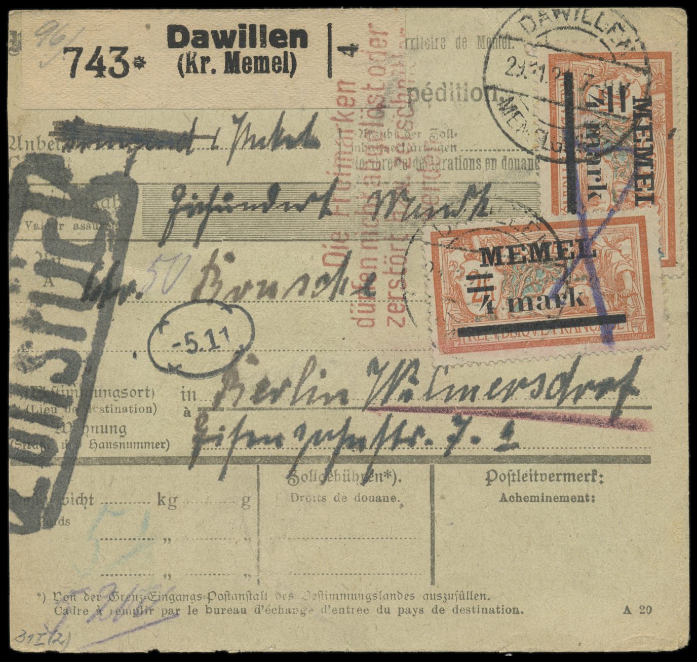 2 x 4 m auf 2 Fr. auf Paketkarte nach Berlin, entwertet mit Stempel Dawillen / Memelgebiet 29.11.21 und Kopierstift-Kreuz, Ankunftstempel 7.12.21, diverse Zollstempel, roter Z4 "Die Freimarken dürfen nicht abgelöst oder zerstört bzw. zerschnitten werden"