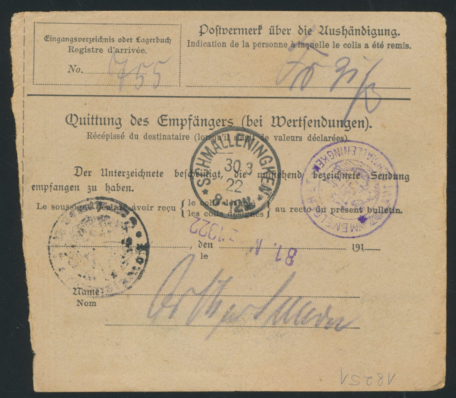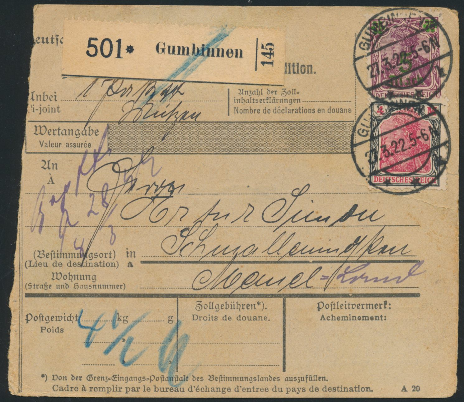 Paketkarte mit Dt. Reich 4 M. und 5 M. auf 75 Pf. von Gumbinnen 27.3.22 nach Schmalleningken, Ankunftstempel Schmalleningken 30.3.22 und violettes Dienstsiegel Memelgebiet / Zollamt Schmalleningken (klarer Abschlag)