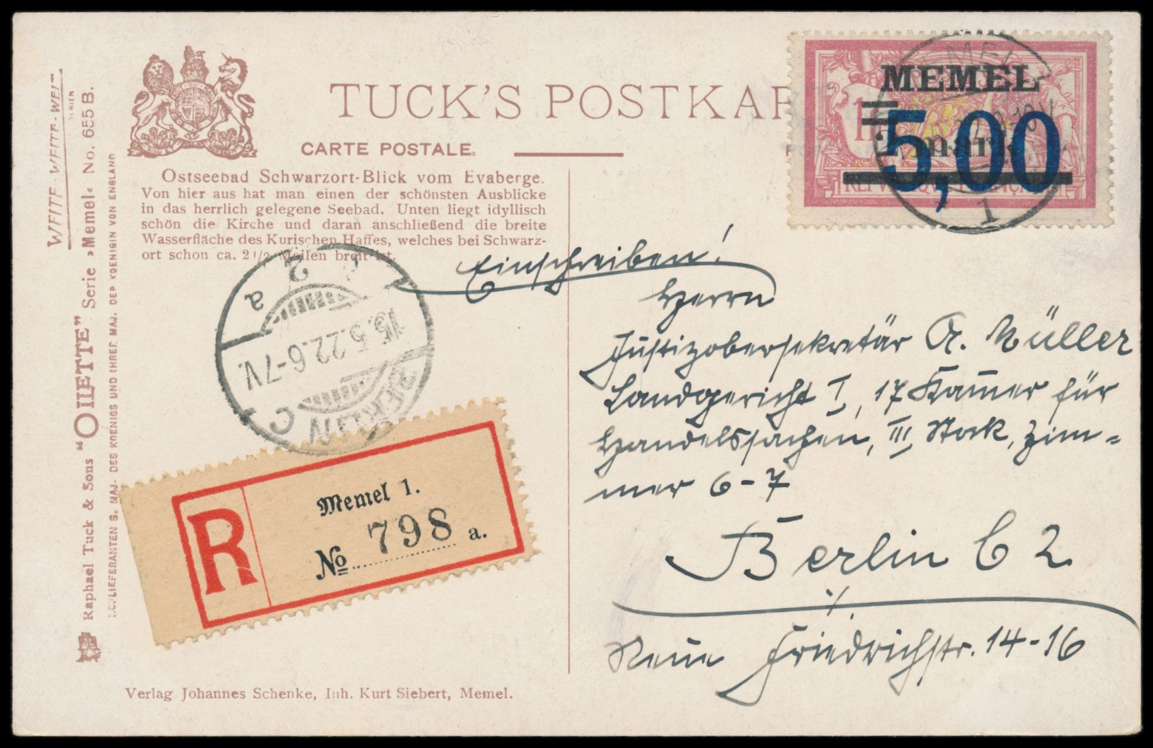 Einzelfrankatur 5,00 M. auf Tuck's Ansichtskarte "Ostseebad Schwarzort, Blick vom Evaberge" als Einschreiben nach Berlin, Stempel Memel 1 f 13.5.22, Ankunftstempel 15.5.22