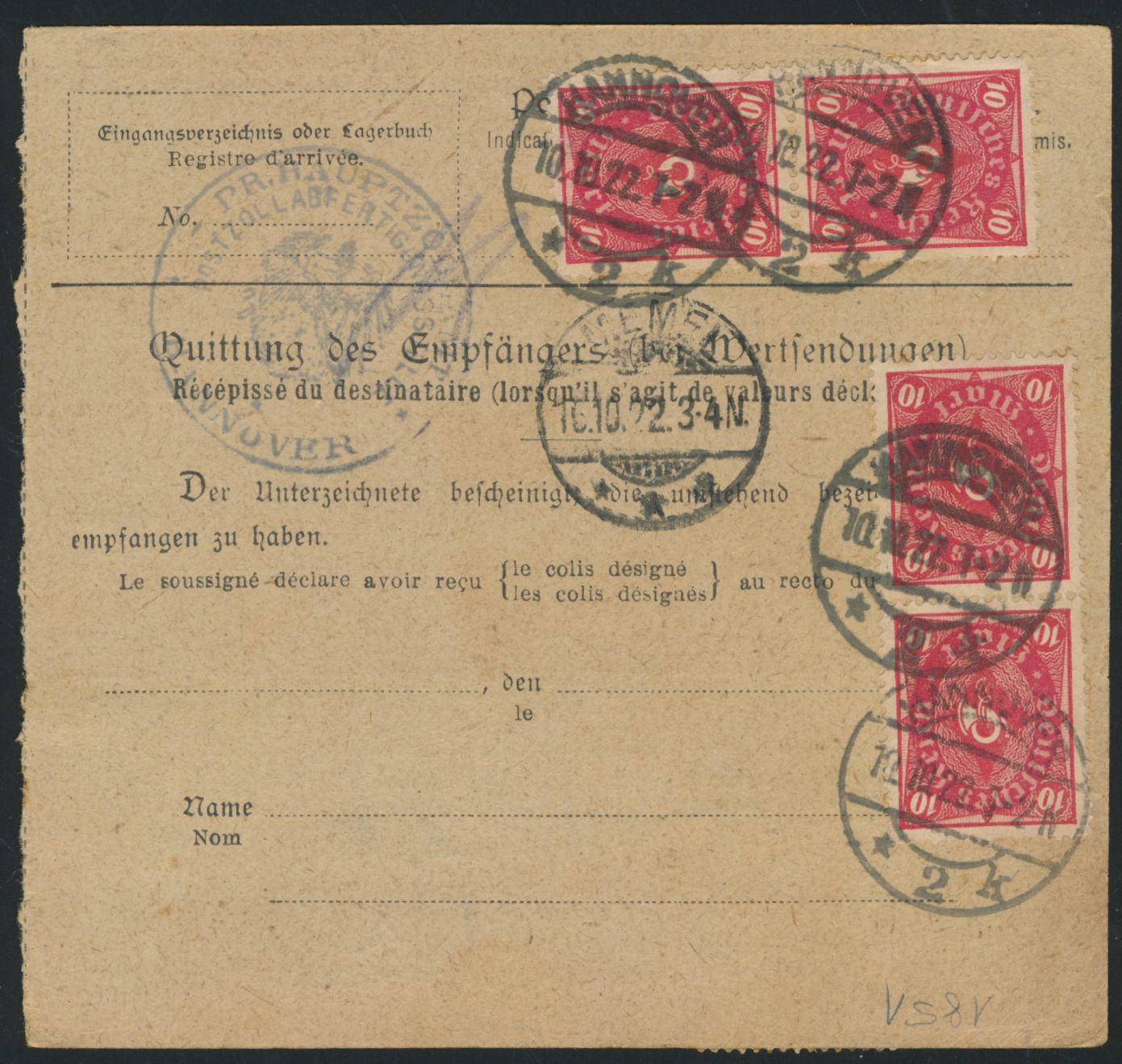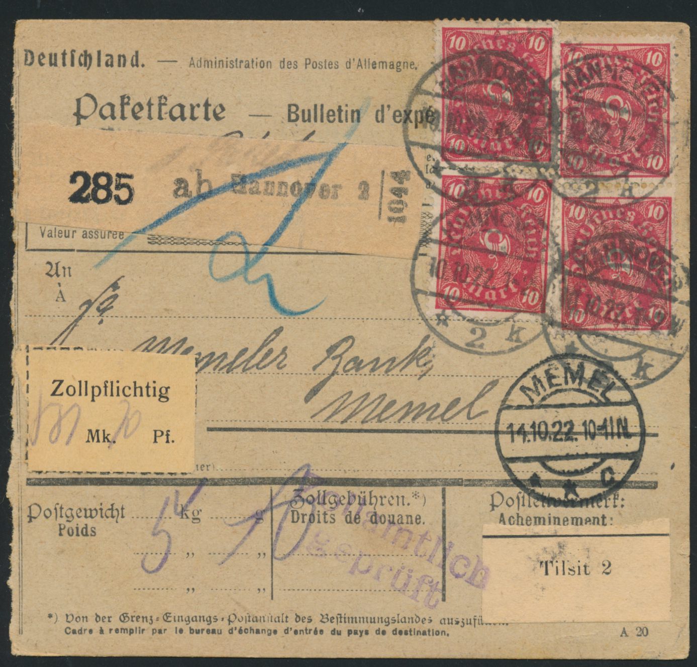 Paketkarte mit Dt. Reich 8 x 10 M. von Hannover 2 10.10.22 nach Memel, Z2 Zollamtlich geprüft, rückseitig Dienstsiegel Pr. Hauptzollamt Hannover / Postzollabfertigungsstelle, Zollgebühr-Zettel, vorderseitig Ankunftstempel Memel 14.10.22
