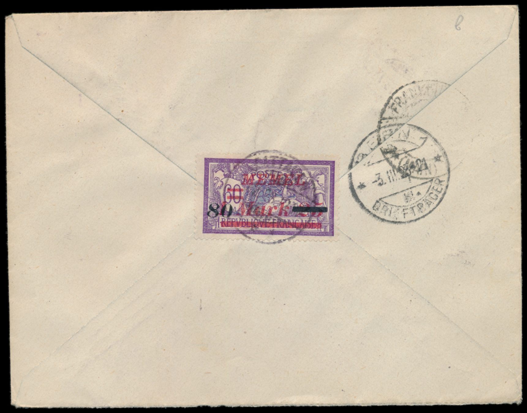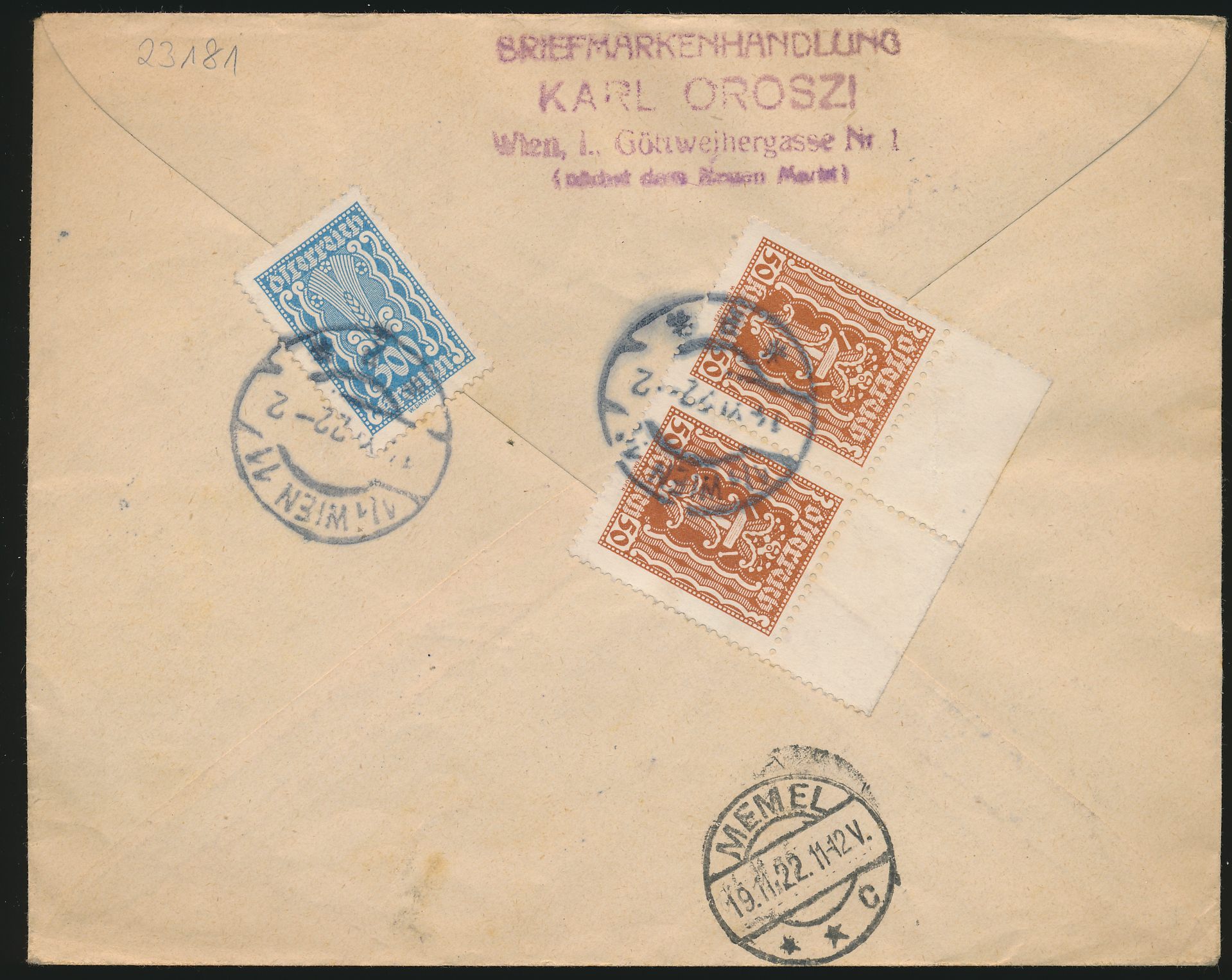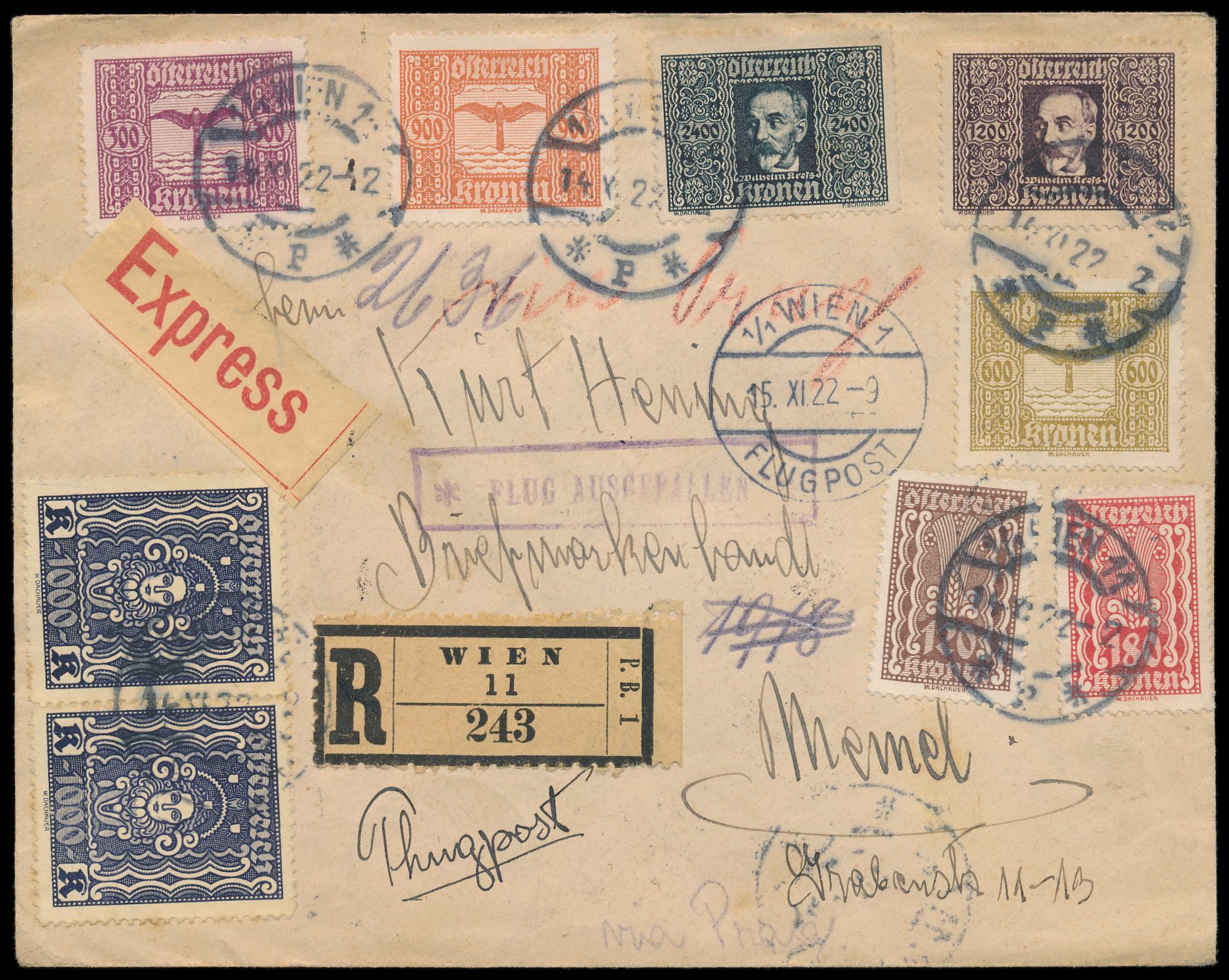 Luftpost-Eilboten-Einschreibbrief aus Österreich via Prag nach Memel, Flugpostmarken und Freimarken beidseitig frankiert, Gesamtporto 8.100 K., Stempel Wien 14.11.22, Durchgangstempel Wien Flugpost 15.11.22, R1 Flug ausgefallen wegen Einstellung des Flugbetriebes am 16.11. (Winterpause), Ankunftstempel Memel 19.11.22