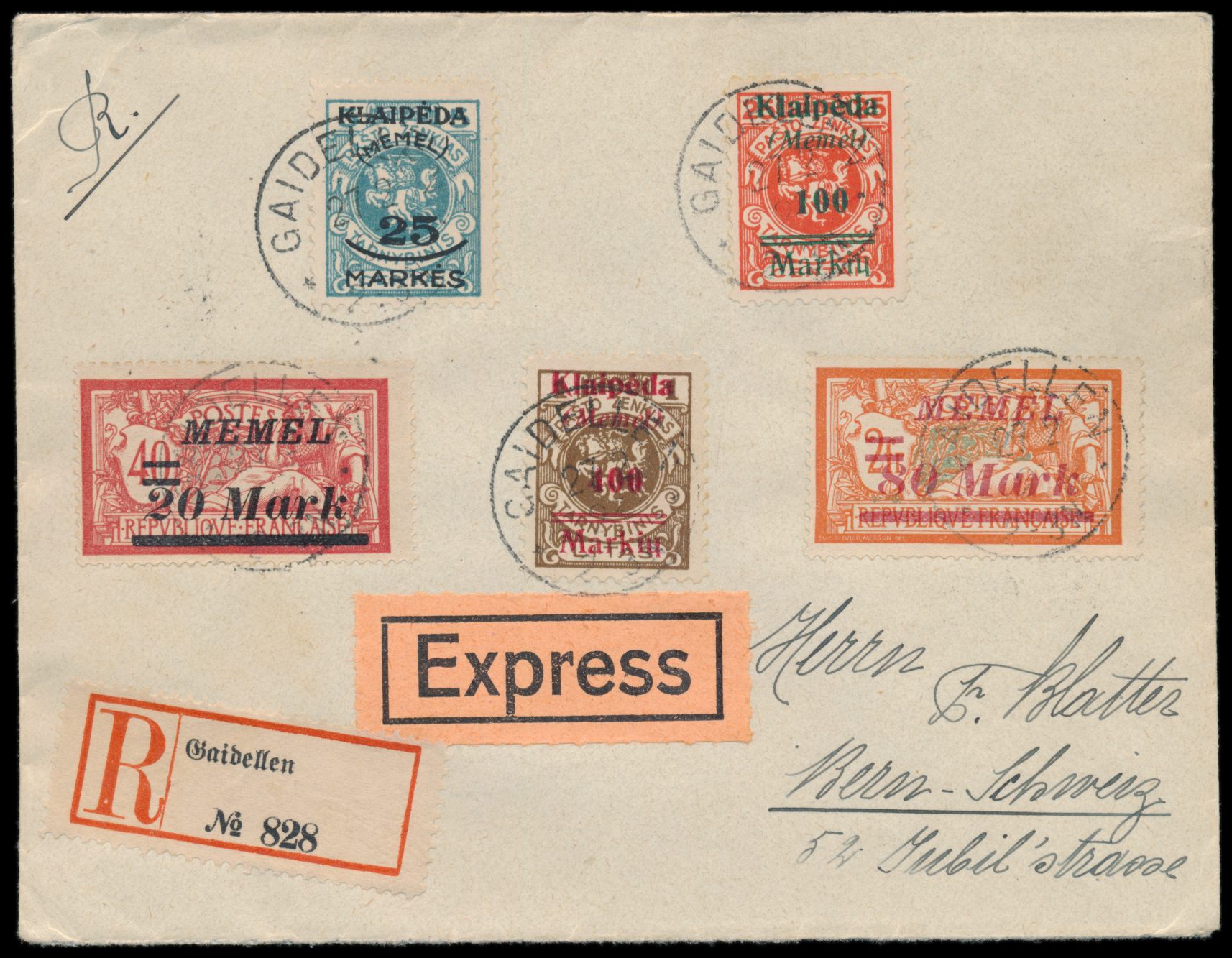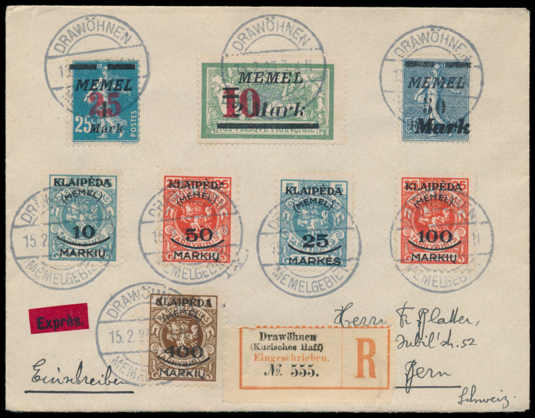 Litauische Besetzung: die ersten zwei Sätze auf Auslands-Eilboten-Einschreibbrief in die Schweiz, Stempel Drawöhnen / Memelgebiet 15.2.23, R-Zettel mit Zusatz "Kurisches Haff" und "R" rechts, Ankunftstempel Bern 18.2.23