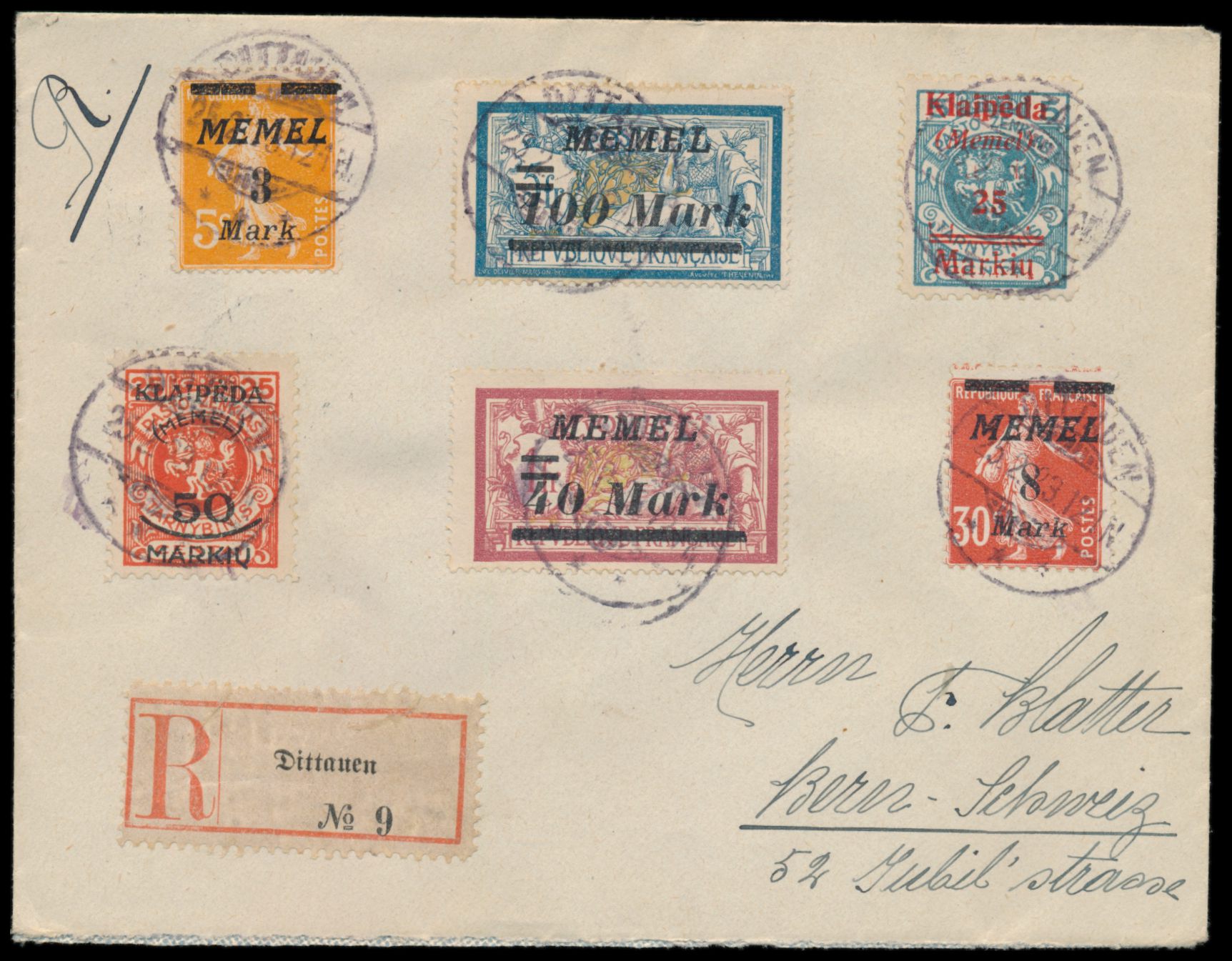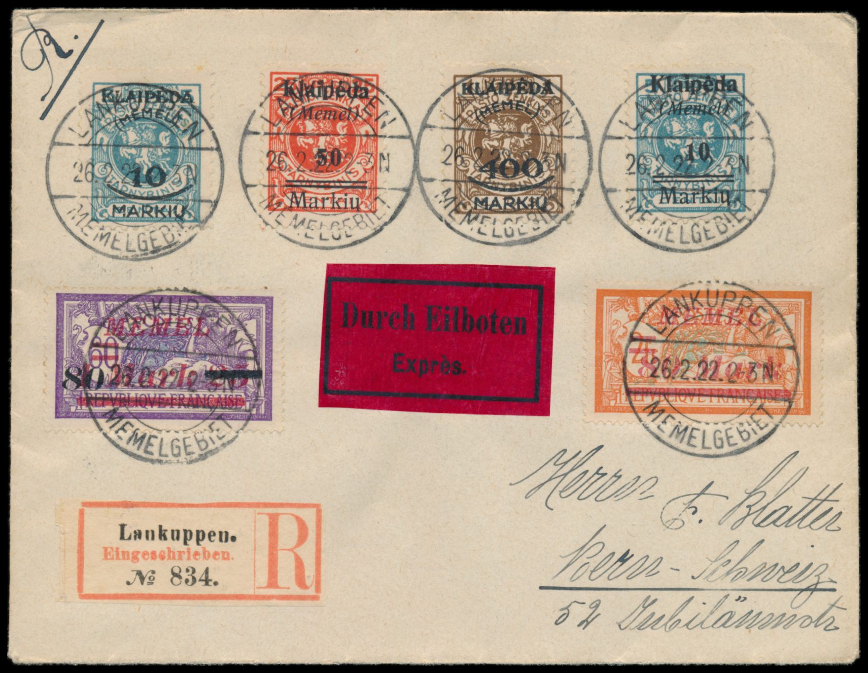 Auslands-Eilboten-Einschreibbrief in die Schweiz, Gesamtfrankatur 630 M., Stempel Lankuppen / Memelgebiet 26.2.23, Ankunftstempel Bern 1.3.23