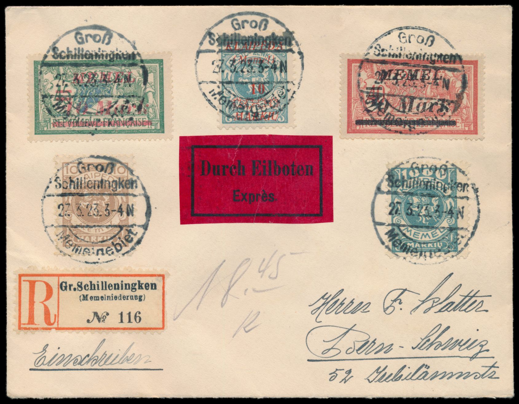 Auslands-Eilboten-Einschreibbrief in die Schweiz, Mischfrankatur 1050 M., seltener Stempel Groß Schilleningken / Memelgebiet 27.3.23, 5 Abschläge, R-Zettel mit Zusatz "Memelniederung", Ankunftstempel Bern 1.4.23