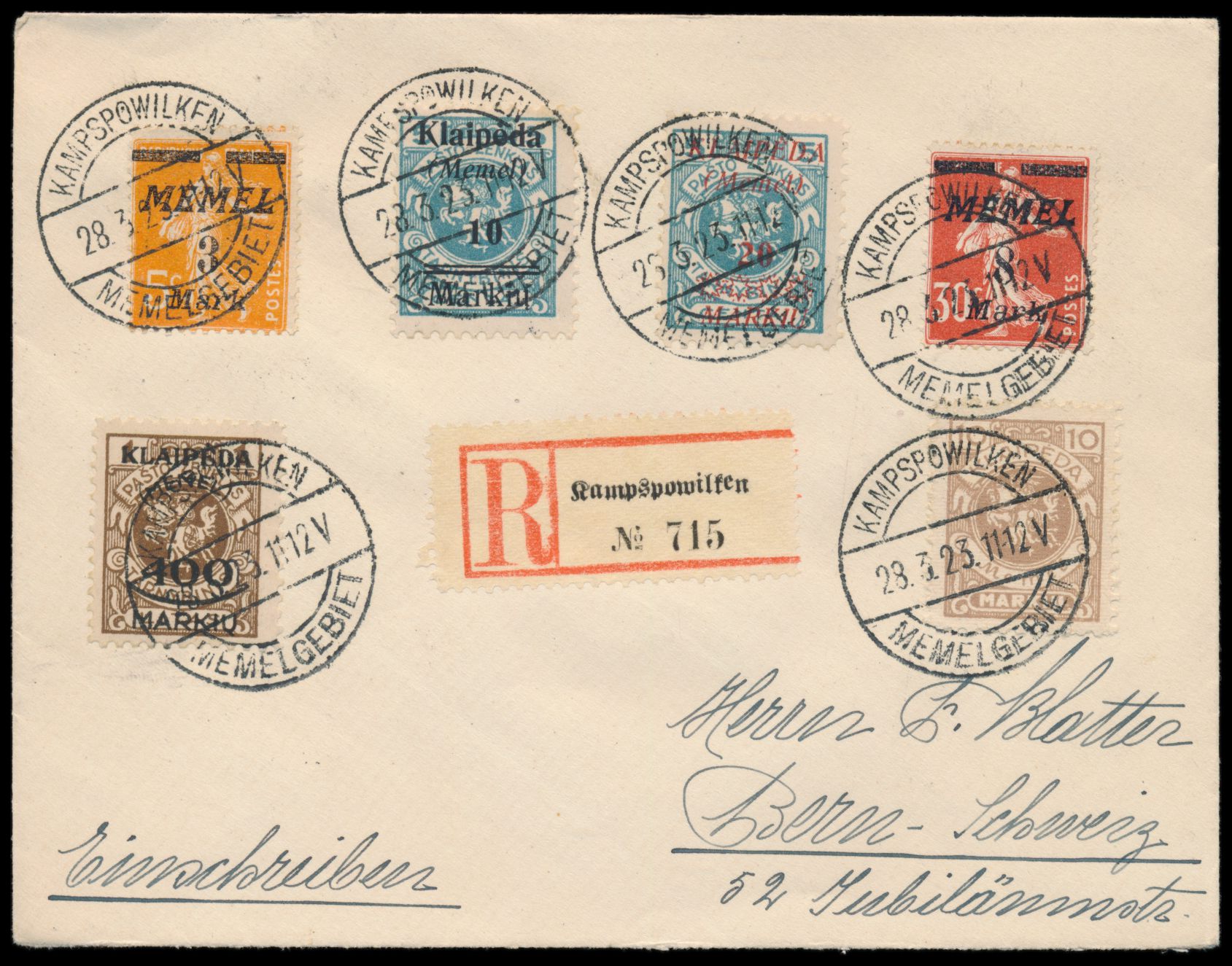Auslands-Einschreibbrief in die Schweiz, Gesamtfrankatur 451 M., Stempel Kampspowilken / Memelgebiet 28.3.23, Ankunftstempel Bern 31.3.23