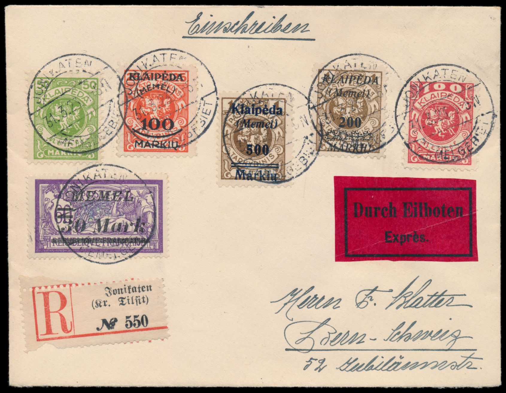 Auslands-Eilboten-Einschreibbrief in die Schweiz, Gesamtfrankatur 980 M., Stempel Jonikaten / Memelgebiet 31.3.23, Ankunftstempel Bern 3.4.23
