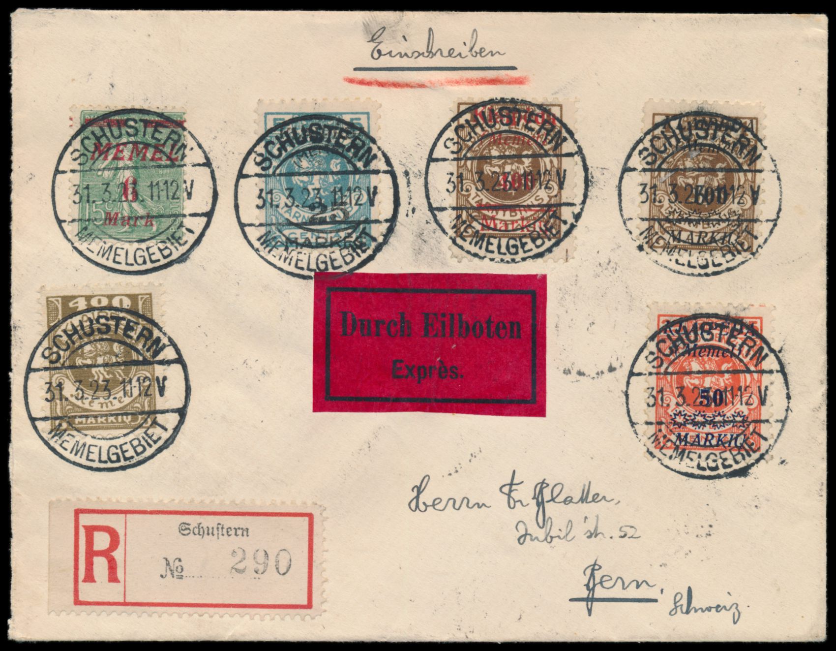 Auslands-Eilboten-Einschreibbrief mit Mischfrankatur in die Schweiz, Gesamtfrankatur 981 M., neuer Stempel Schustern / Memelgebiet 31.3.23, Ankunftstempel Bern 3.4.23