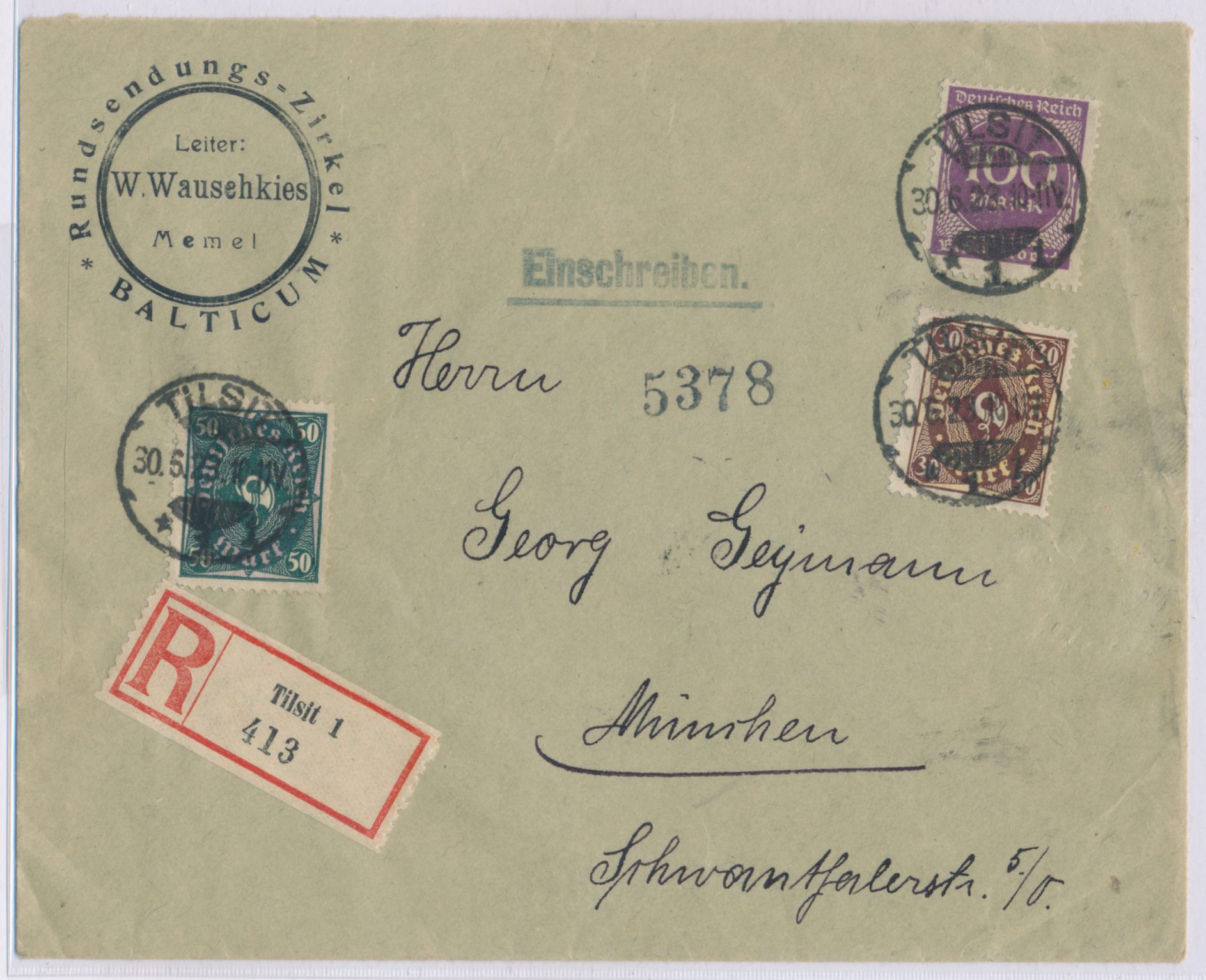 Einschreibbrief mit Dt. Reich-Frankatur 180 M auf Einschreibbrief mit Stempel Tilsit 1 30.6.23 nach München, vorderseitig gedruckter Absender aus Memel, Ausnutzung des Währungsgefälles, Ankunftstempel 2.7.23, portorichtig, Bedarf