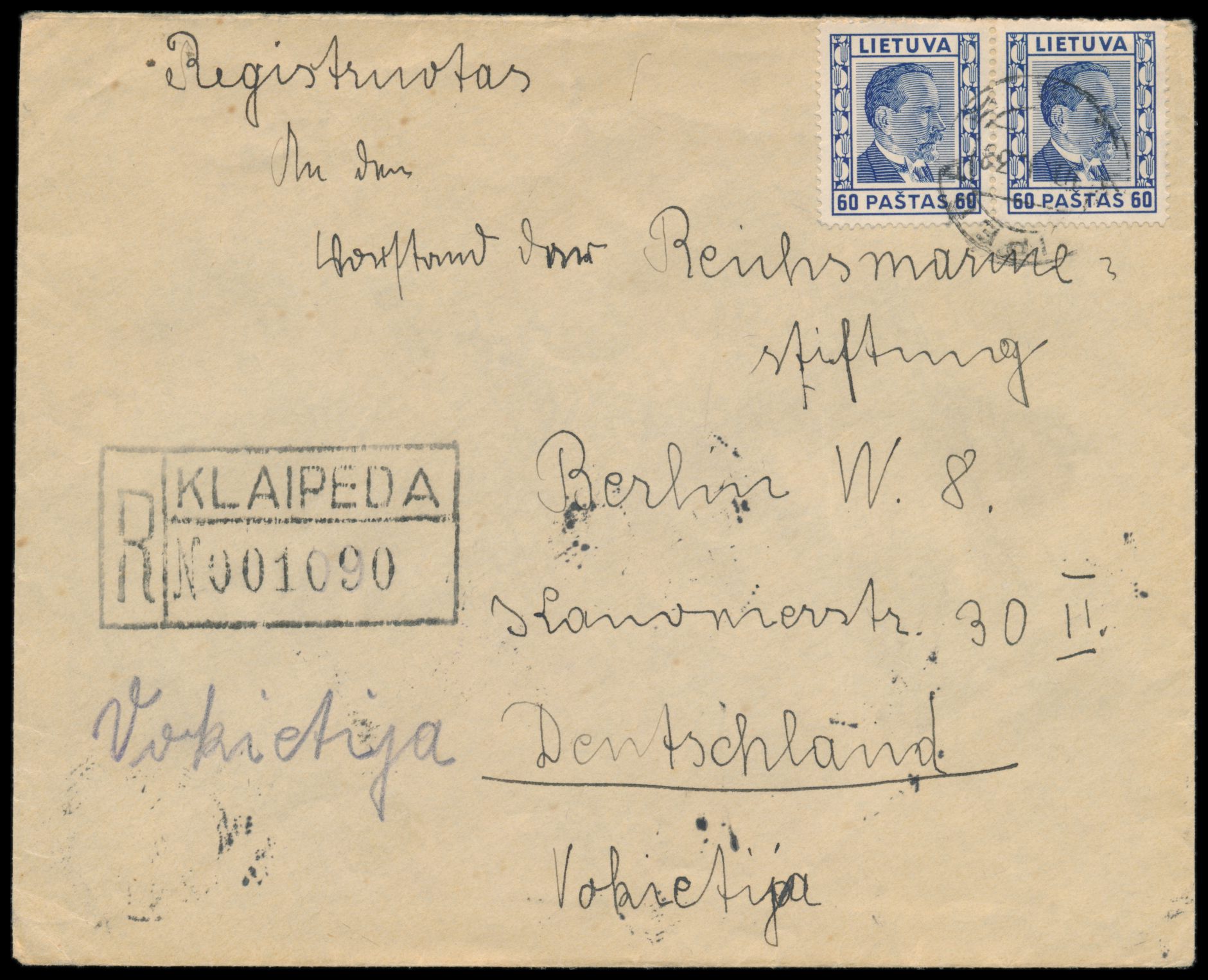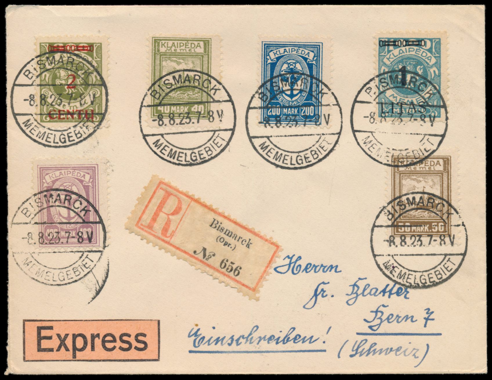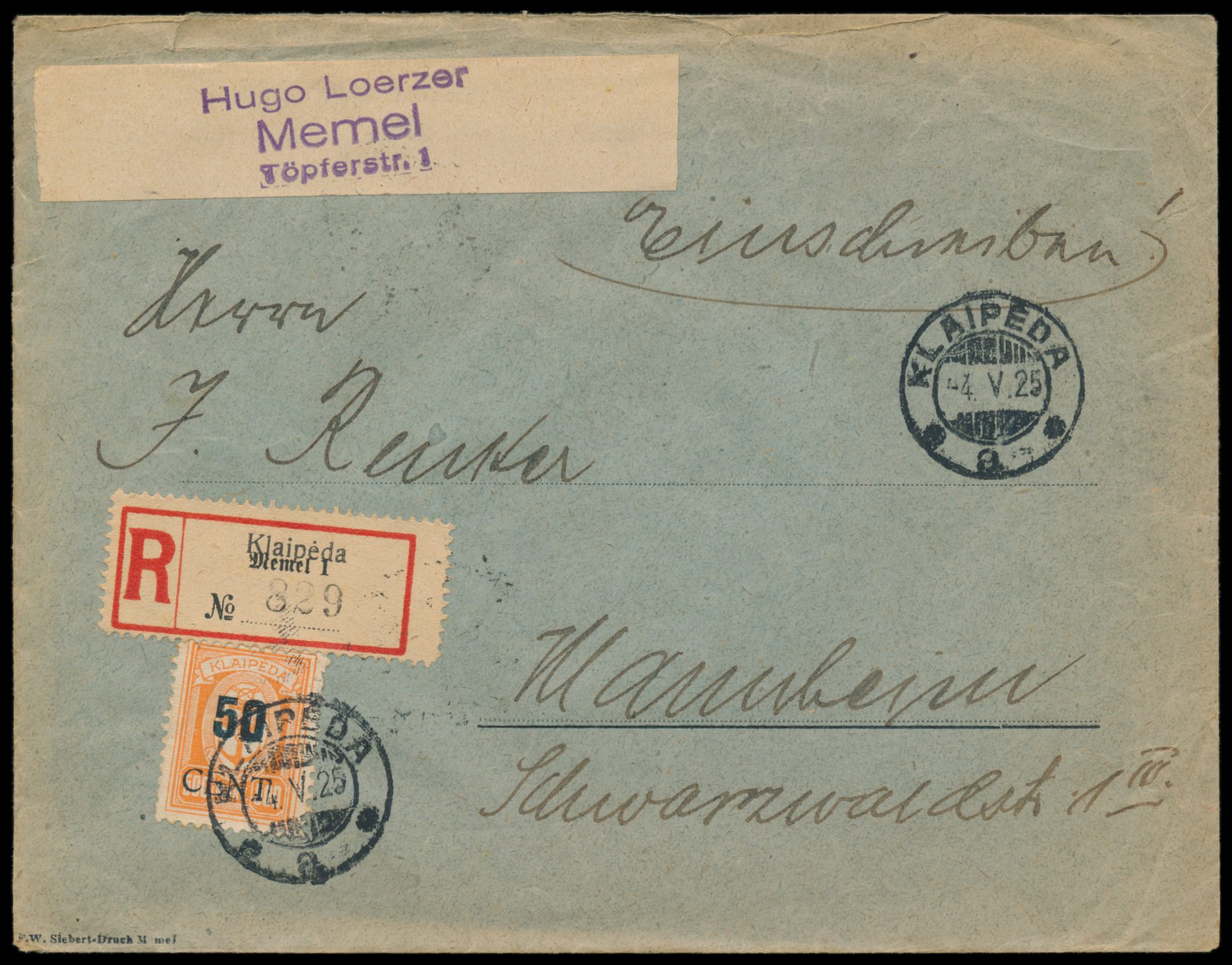 Einzelfrankatur 50 C. auf 500 M. auf Einschreibbrief mit Stempel Klaipeda 4.5.25 nach Mannheim, R-Zettel Memel 1 überdruckt "Klaipeda" , Ankunftstempel 8.5.25, portorichtig, Bedarf
