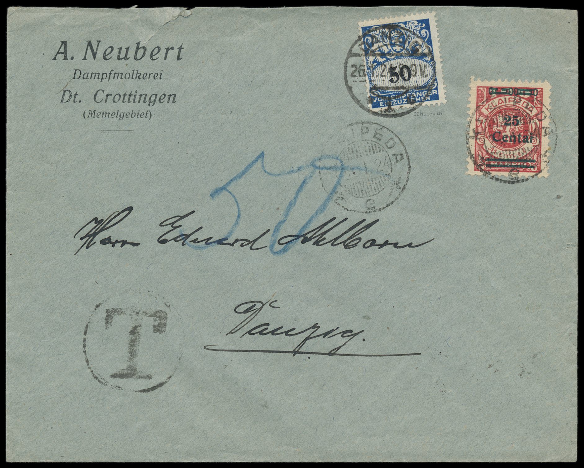 Einzelfrankatur 25 C. auf 100 M auf Firmenbrief von Klaipeda 24.1.24 nach Danzig, unterfrankiert da Auslandsporto, großer T-Kreisstempel, Danzig-Portomarke 50 Pf. (MiNr. 35) frankiert, Stempel Danzig 1 26.1.24, Bedarf, geprüft Schüler BPP