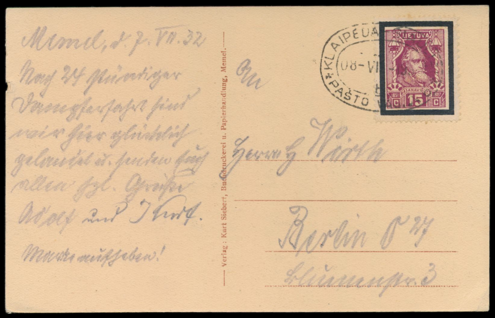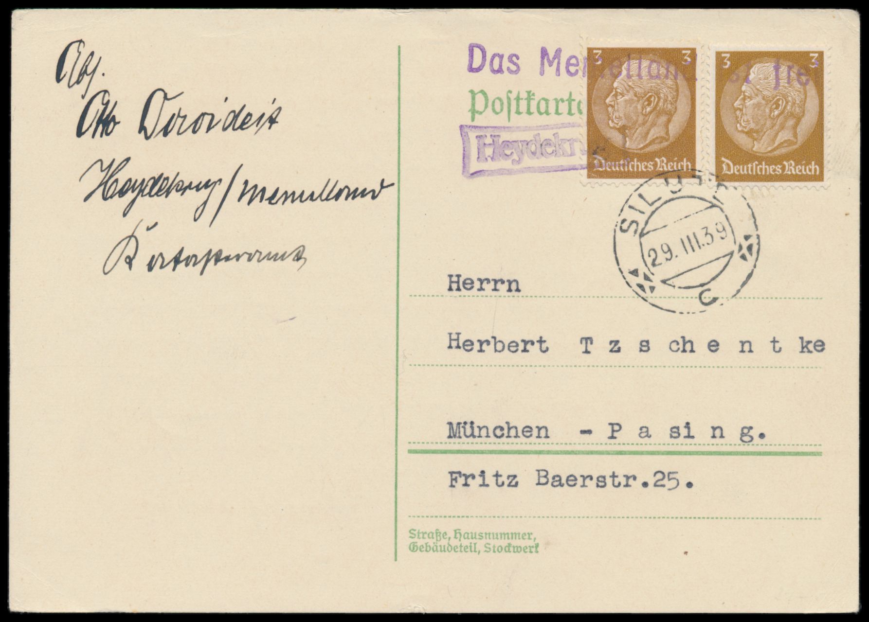 violetter Not-1 Heydekrug mit L1 "Das Memelland ist frei" und litauischem Stempel Silute 29.3.39 auf Postkarte mit 2 x 3 Pf. Hindenburg nach München, rückseitig sehr llanger Bedarfstext