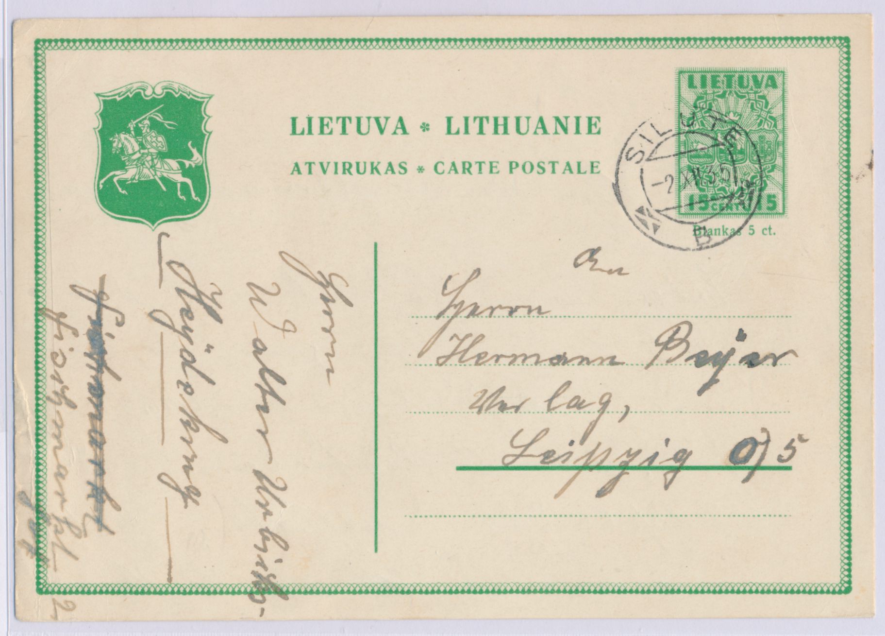 Litauen-Ganzsache 15 C. Wappen mit Krone (1934) aus Heydekrug mit Stempel Silute 2.12.35 zum Inlandstarif nach Leipzig, Bedarf