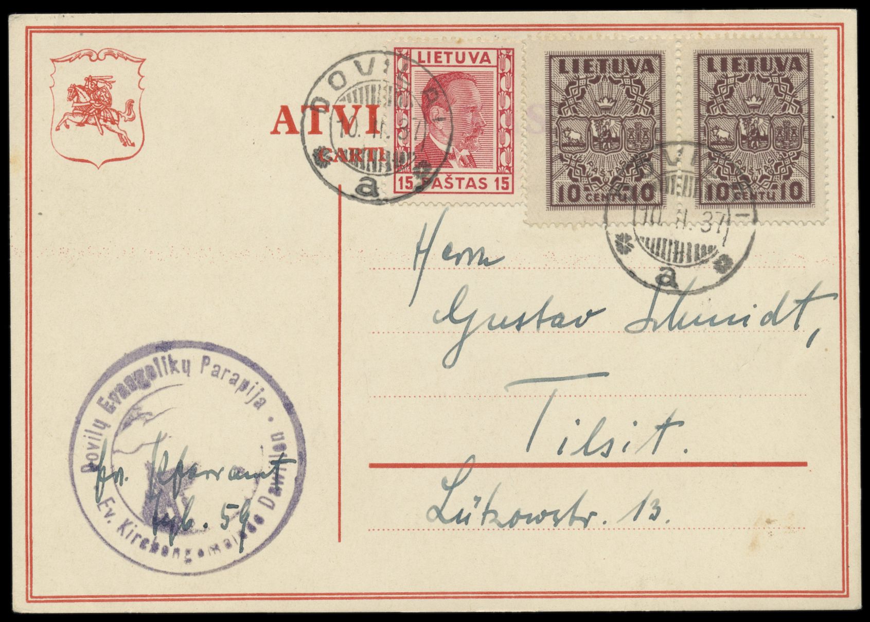 Litauen 2 x 10 C. und 15 C. auf Postkarten-Formular mit Stempel Dovilai 10.2.37 nach Tilsit, zweisprachiges Siegel ... Ev. Kirchengemeinde Dawillen vorder- und rückseitig, Bedarf