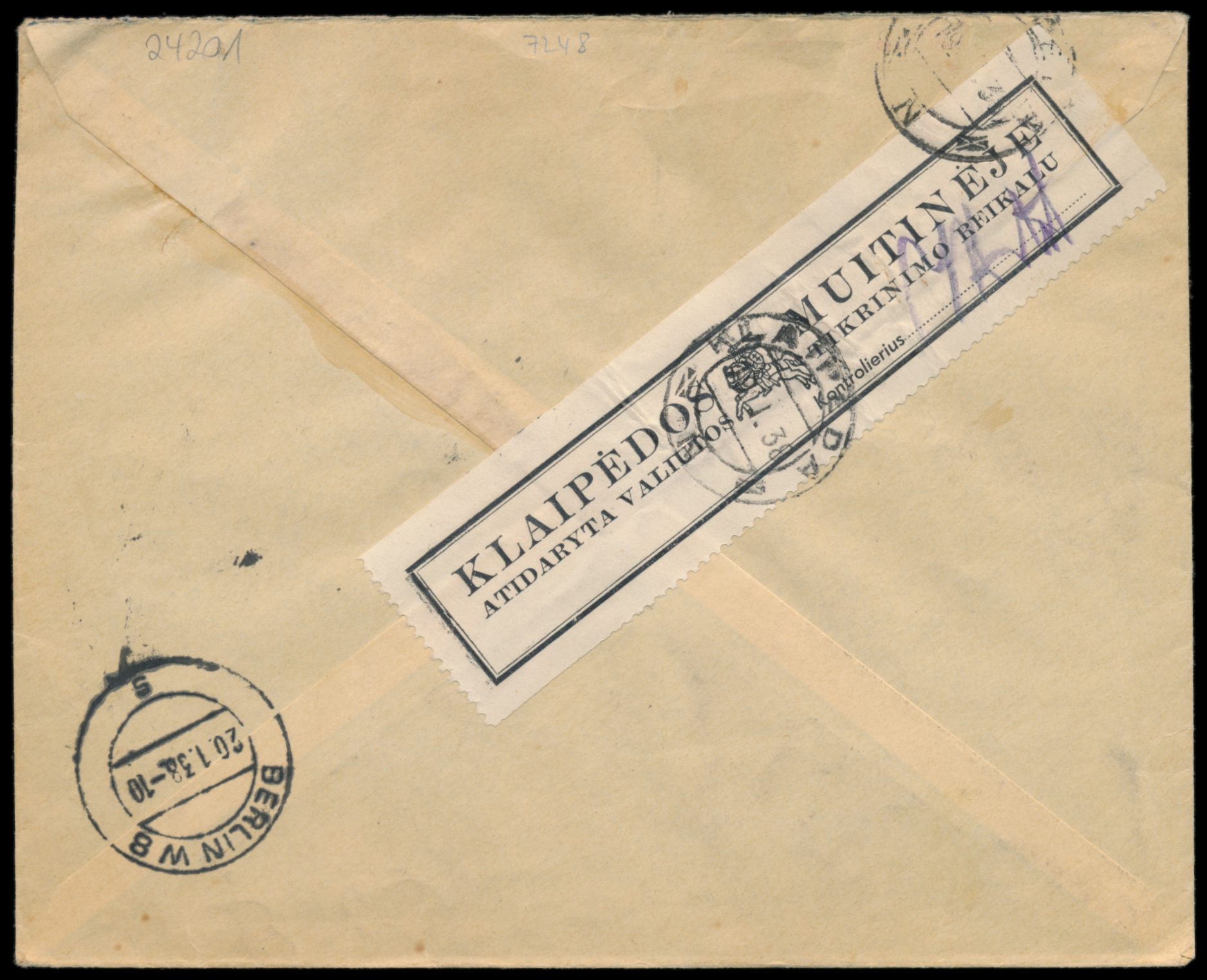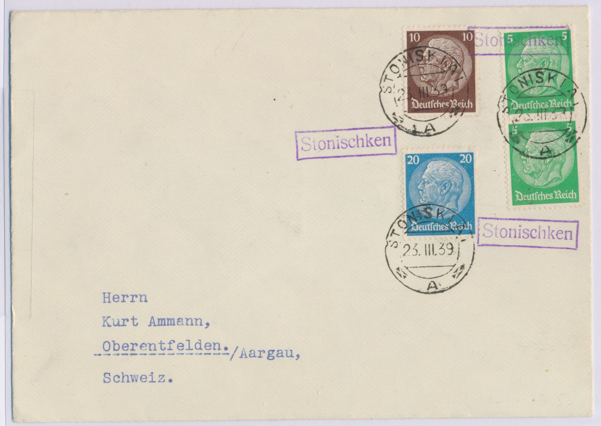 3 x violetter R1 Stonischken und litauischer Stempel Stoniskiai 23.III.39 auf Auslandsbrief 2. Gewicht in die Schweiz, Hindenburg-Frankatur 40 Pf.
