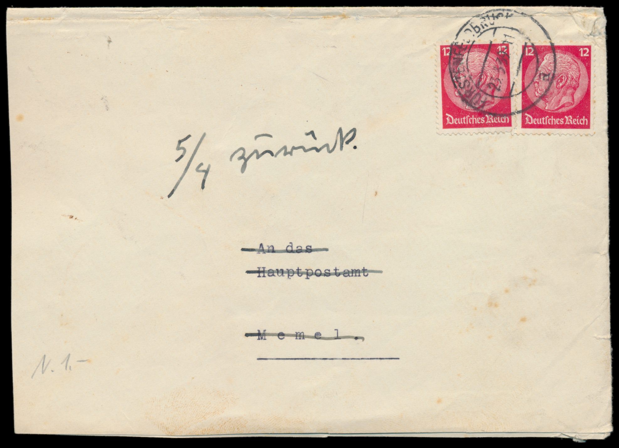 Brief aus Fürstenfeldbruck 23.3.39 an das Postamt Memel, mit violettem L4 "Überdruckmarken sind von deutscher Reichspost nicht hergestellt worden. Postamt Memel" und Postamt-Verschlußzettel mit L1 Memel zurück an den Absender