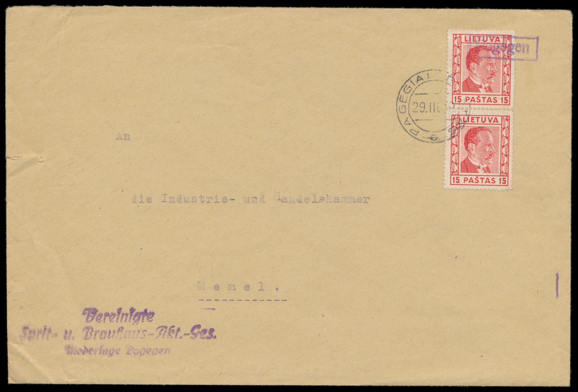 violetter R1 Pogegen und litauischer Stempel Pagegiai 29.III.39 auf Brief mit Litauen 2 x 15 Pastas an die Industrie- und Handelskammer in Memel, Absenderstempel "Vereinigte Sprit- u. Brauhaus-Akt.-Ges. Niederlage Pogegen", Bedarf