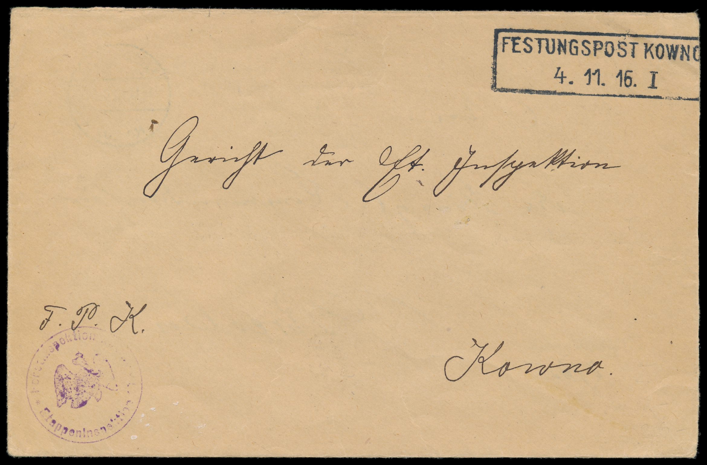 Rahmenstempel Festungspost Kowno 4.11.16. I auf Dienstbrief mit Briefstempel Forstinspektion ... an das Gericht der Etappen-Inspektion in Kowno