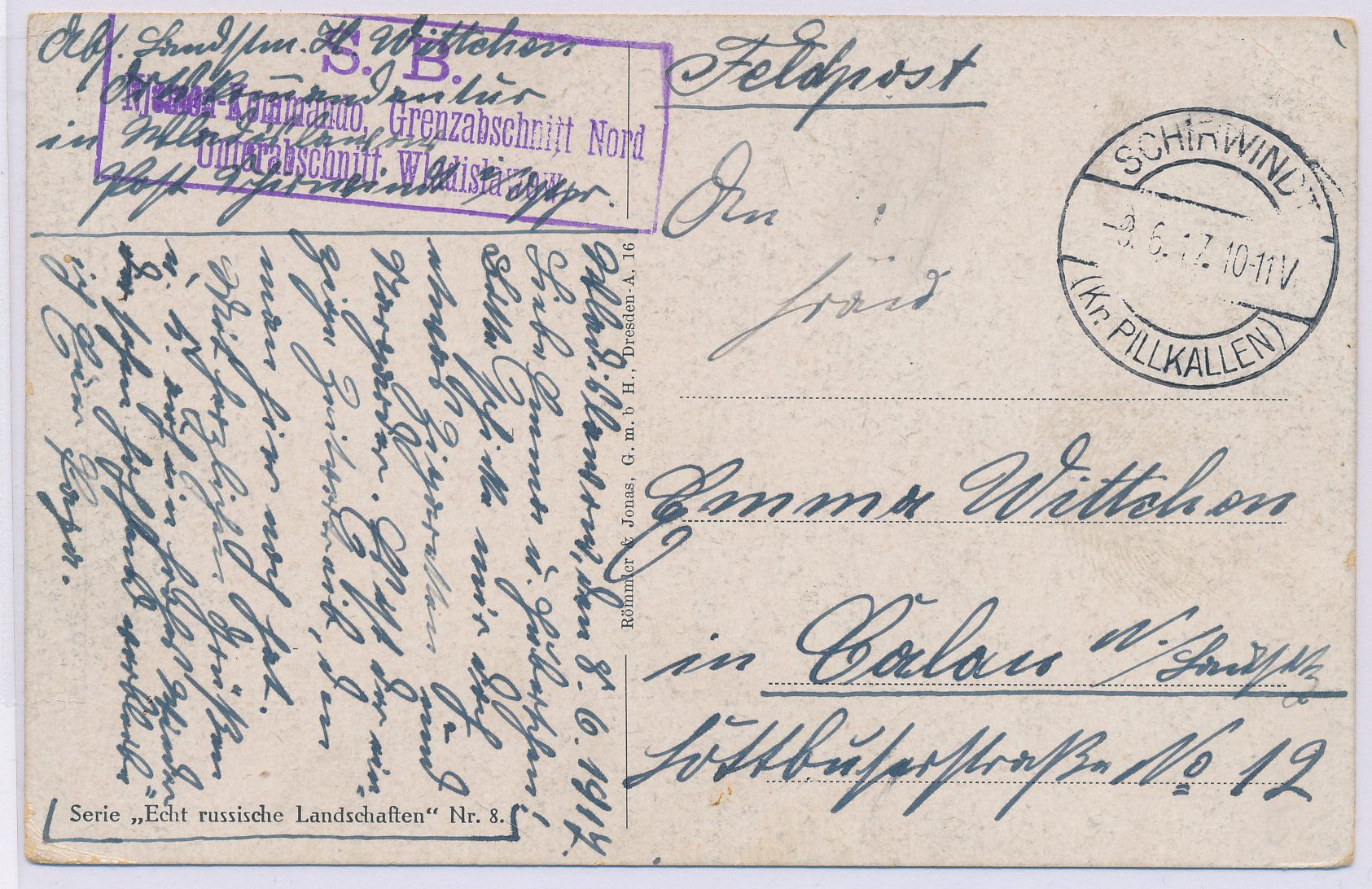 Feldpostkarte mit Stempel Schirwindt (Kr. Pillkallen) 8.6.17, seltener Briefstempel S. B. / Njemen-Kommando, Grenzabschnitt Nord / Unterabschnitt Wladislawow, nach Calau, Bedarf