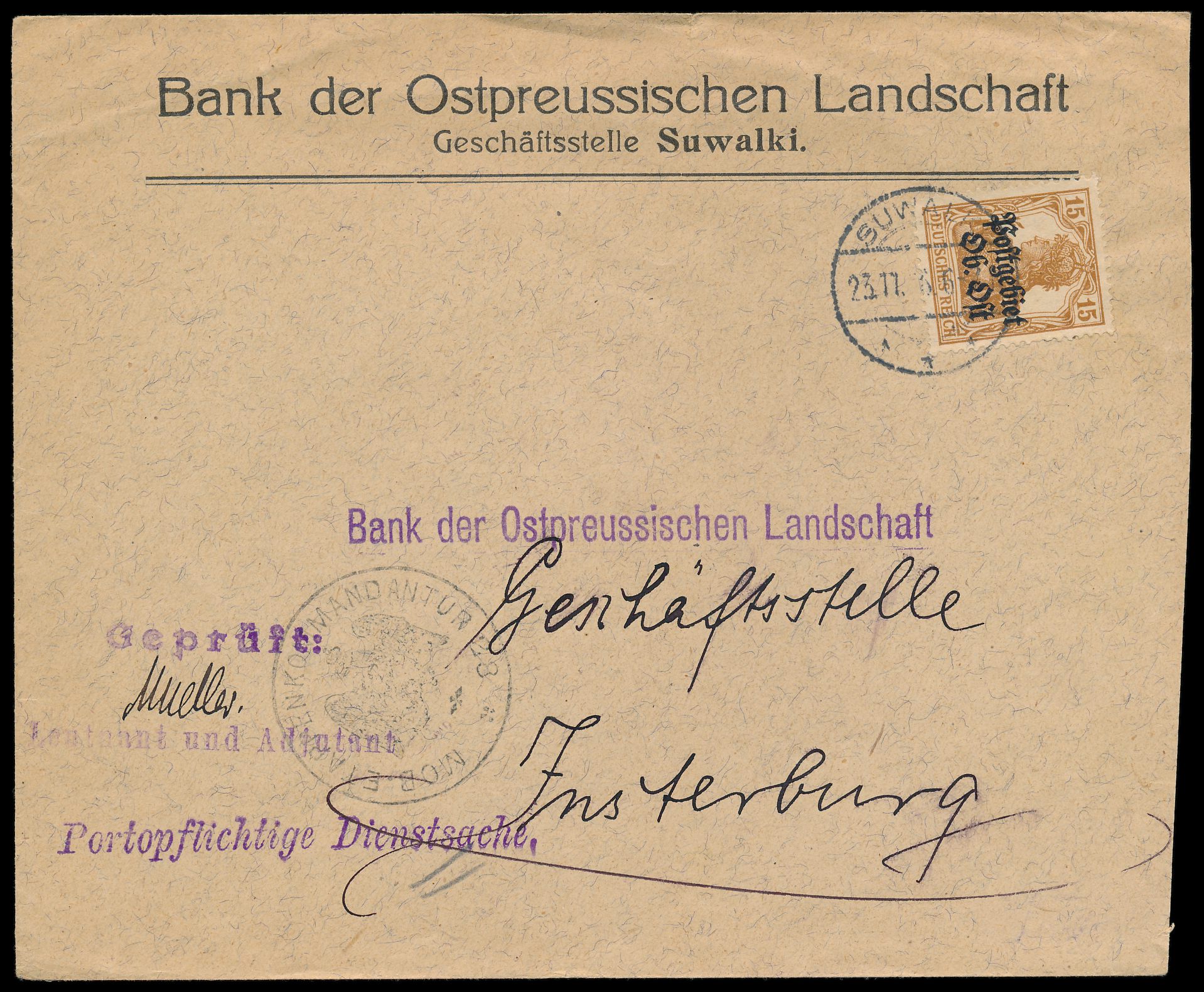 Brief der "Bank der Ostpreussischen Landschaft" mit Stempel Suwalki 23.11.16 nach Insterburg, violetter Setzkasten-L2 Geprüft: ... Leutnant und Adjutant mit Unterschrift "Mueller" und Dienstsiegel Mob. Etappenkommandantur 28, ähnlich dem im Dreher-Handbuch auf S 127 abgebildetem Stück, vermutlich 2. bekannter Beleg mit dieser Zensur