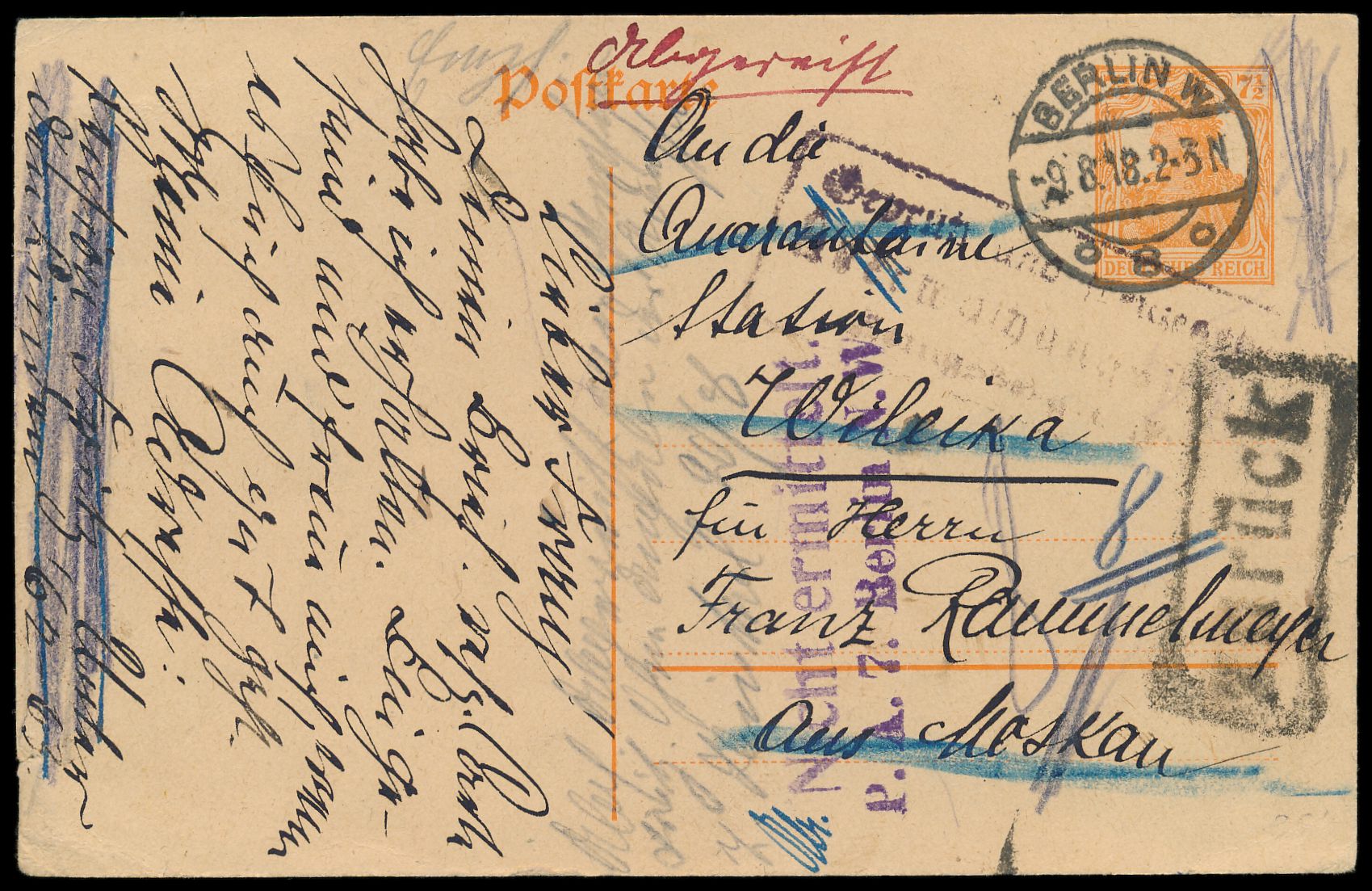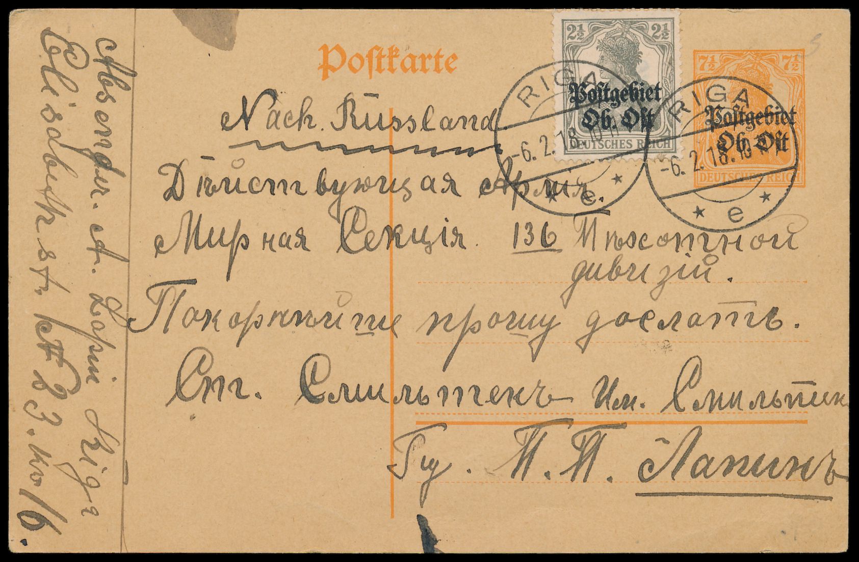 Ganzsache 7 1/2 Pf. mit Zusatzfrankatur 2 1/2 Pf., Stempel Riga e 6.2.18, nach Russland, während des eingeschränkten Postverkehrs während des Waffenstilltandes (Ende Januar bis 17.2.1918). Zugelassen waren nur Postkarten.
