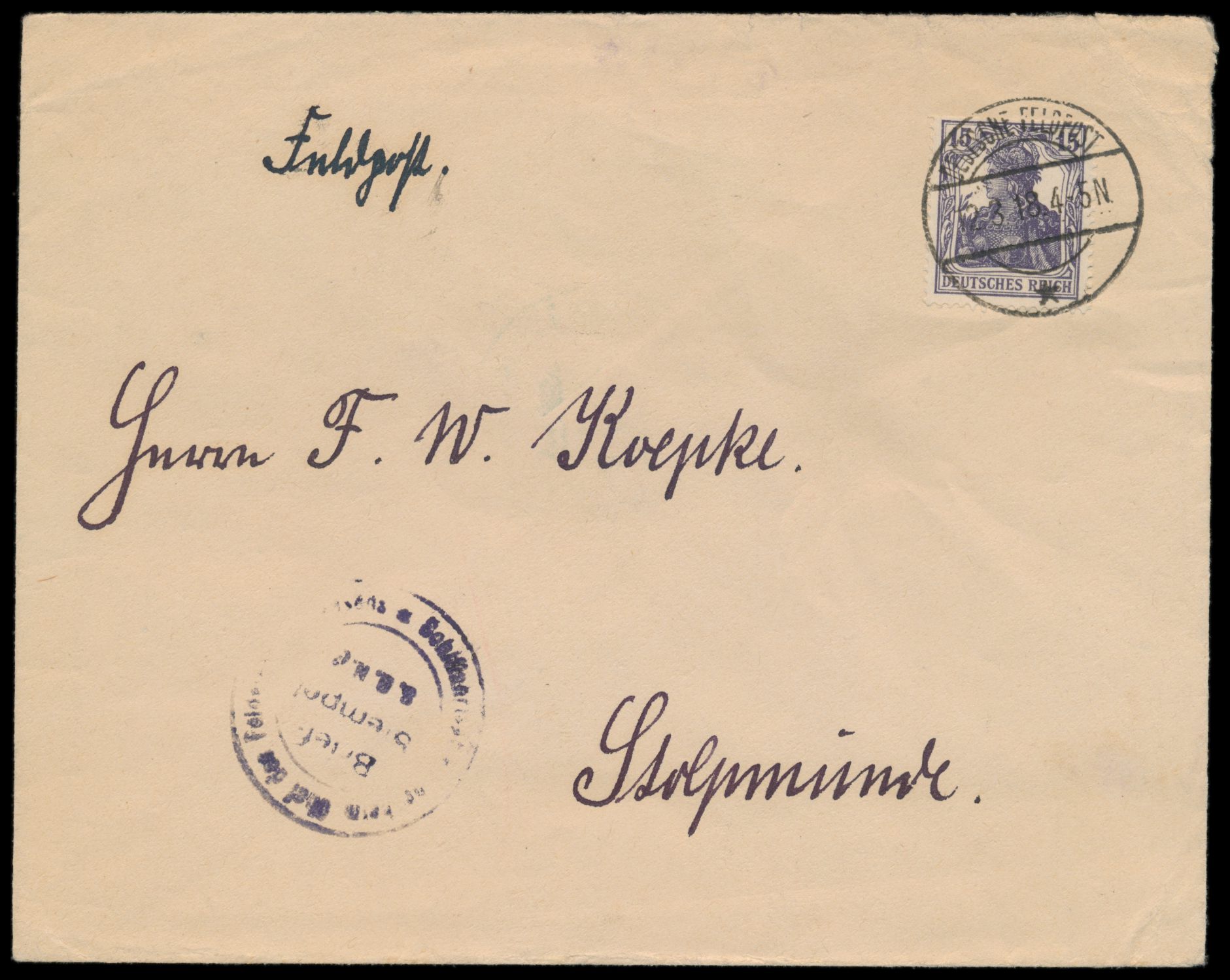 Dt. Reich 15 Pf. (oben Markenheftchenschnitt) auf Brief mit Stempel Deutsche Feldpost 12.3.18 nach Stolpmünde, handschriftlicher Absender "Kapitän Hans Euler. Dampfer Arnold Koepke z. Zt. Libau", vorderseitig undeutlicher Briefstempel, Bedarf