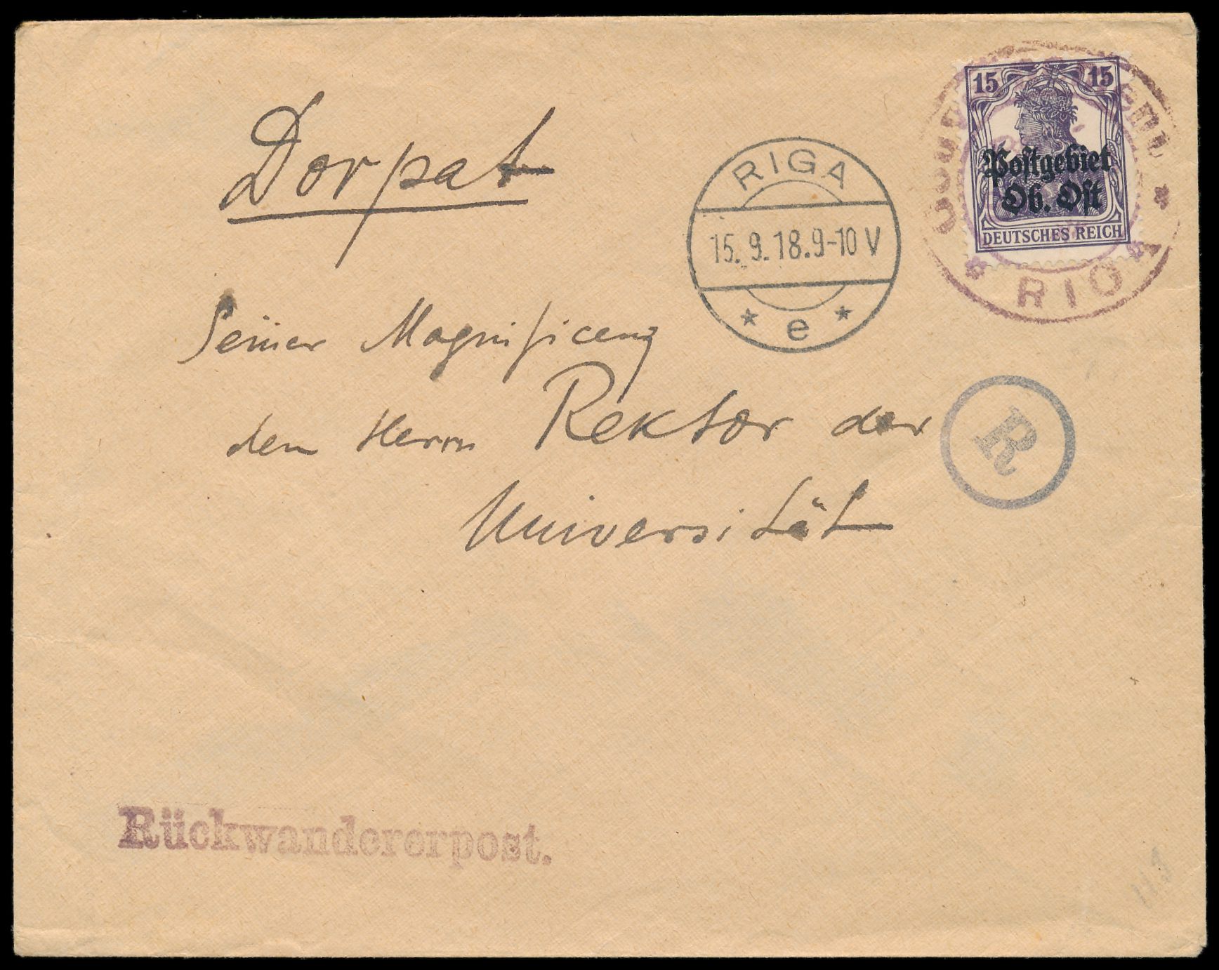 Brief (ohne Absenderangabe) mit L1 Rückwandererpost, Frankatur 15 Pf.-Marke mit Briefstempel Gouvernement Riga entwertet, nebengesetzter Stempel Riga e 15.9.18 und Zensurstempel "R" von Riga, nach Dorpat