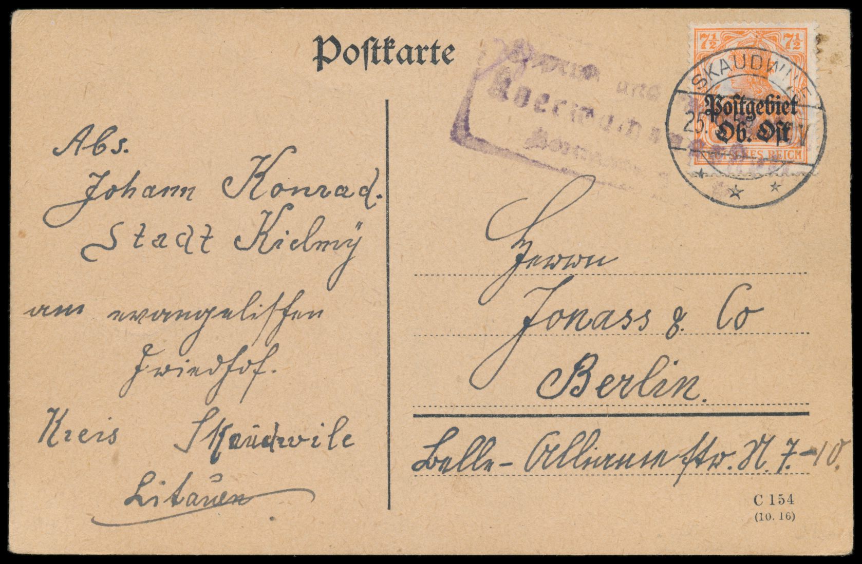 seltener Stempel Skaudwile 25.9.18 auf Postkarte (C 154-Formular) aus Kielmy nach Berlin, Zensurstempel Königsberg, Bedarf