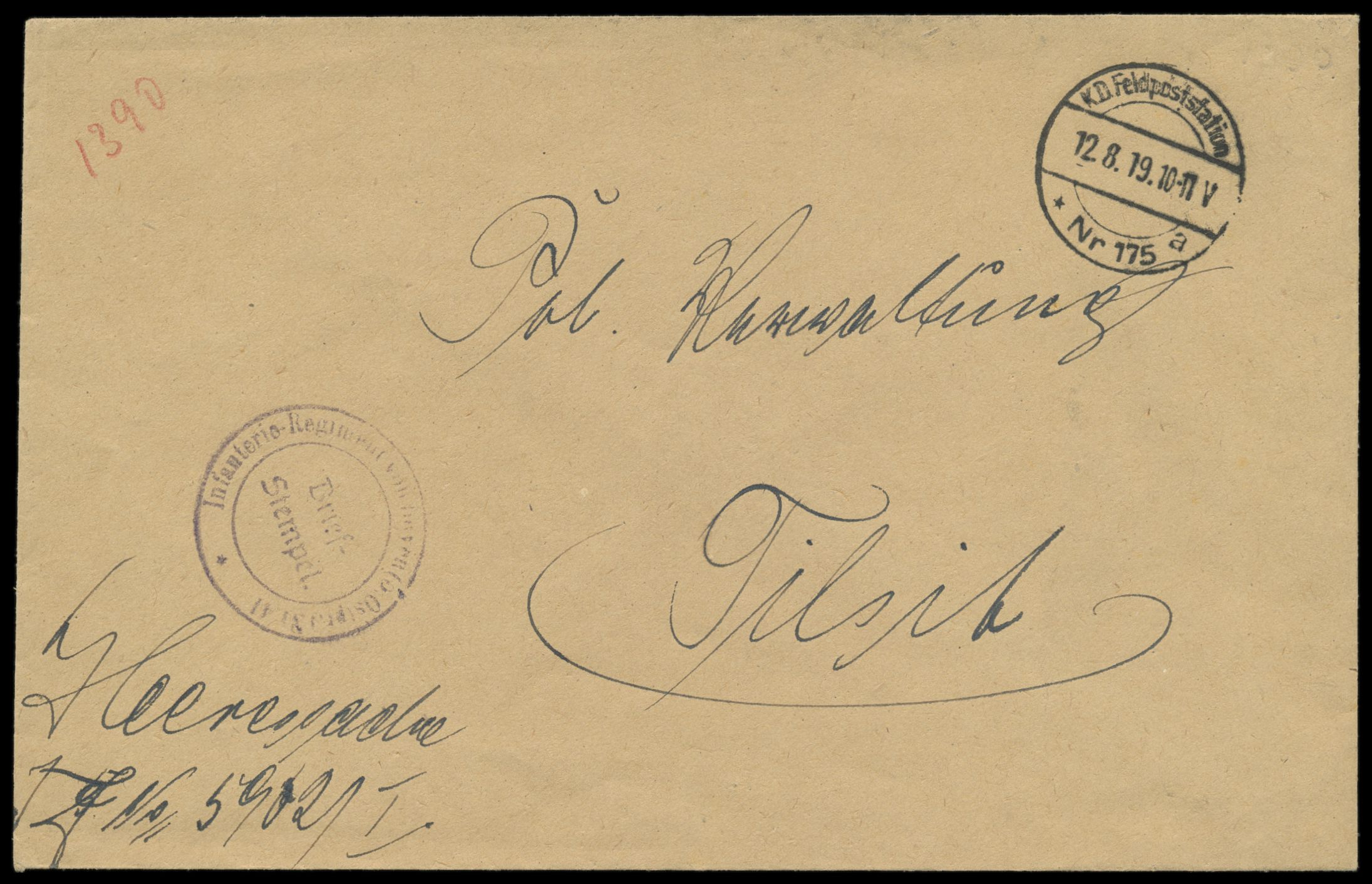 Grenzschutz Ost, Stempel K. D. Feldpoststation Nr. 175 a 12.8.19 (Standort Tilsit) auf Dienstbrief "Heeressache" nach Tilsit, beidseitig viol. Briefstempel Infanterie-Regiment von Boyen (5. Ostpr.) Nr. 41
