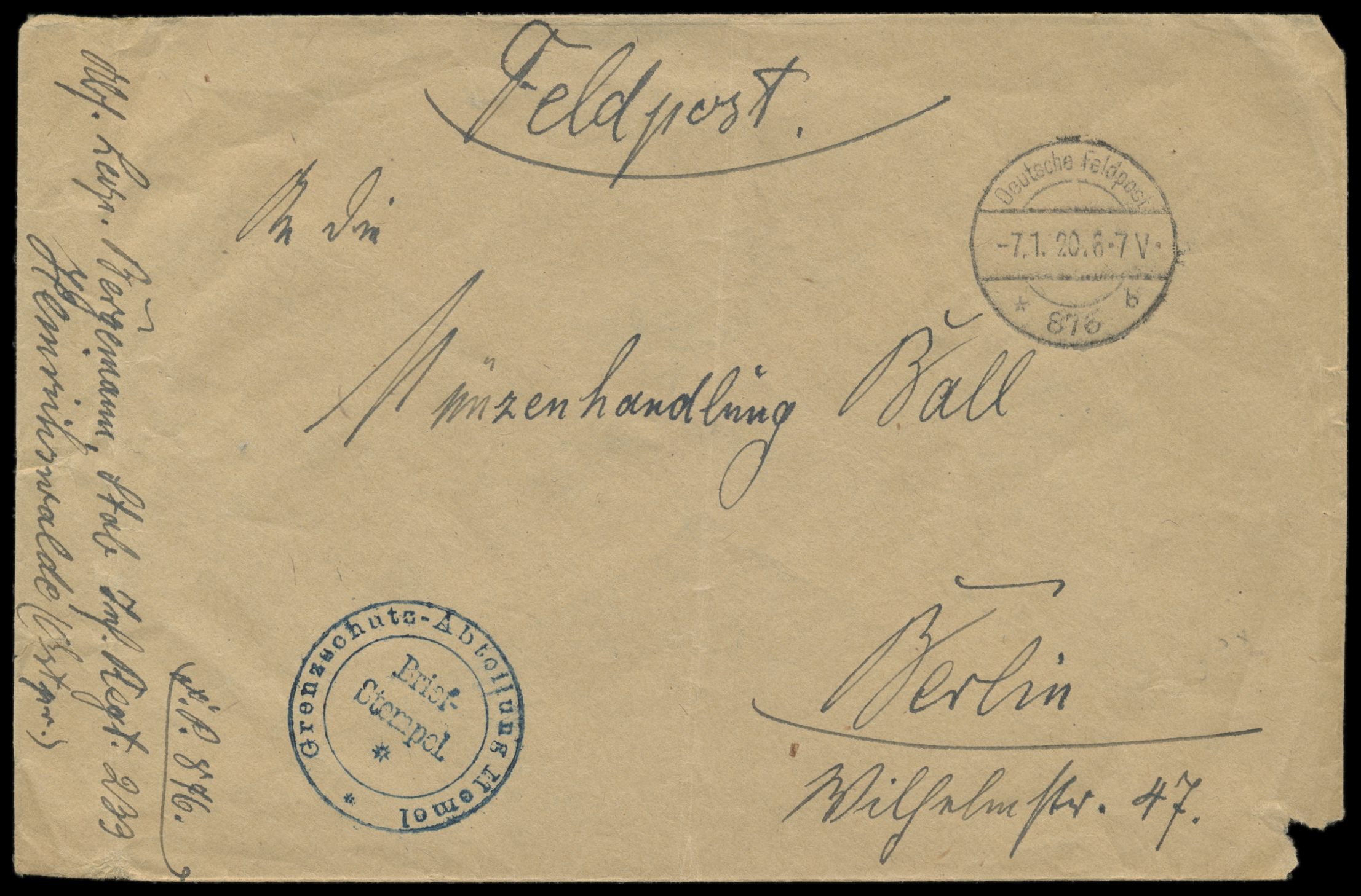 Grenzschutz Ost, Stempel Deutsche Feldpost 876 b 7.1.20 und Briefstempel Grenzschutz-Abteilung Memel auf Feldpostbrief mit vorderseitig handschriftlicher Absender "... Stab Inf. Regt. 233, Heinrichswalde (Ostpr.)" nach Berlin, senkrechter Mittelbug und rechts unten winziger Eckausriss