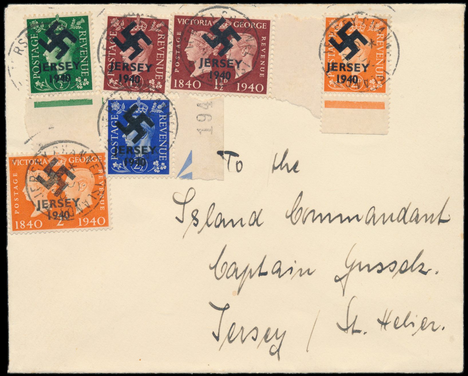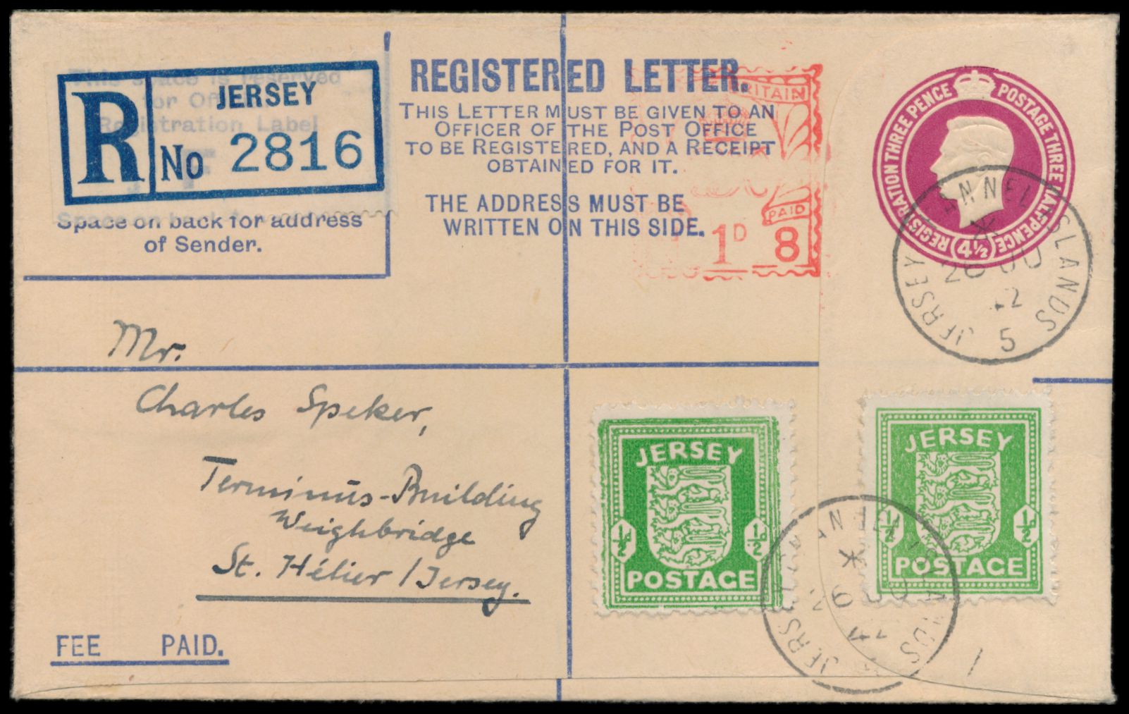 Jersey, R-Ganzsachenumschlag 4 1/2 d. (Format F, mit Neopostfreistempel (Maschinen-Nr. 8) 1 d. und 2 x Jersey 1/2 d., Stempel Jersey - Channel Islands 5 26.6.42, nach St. Helier