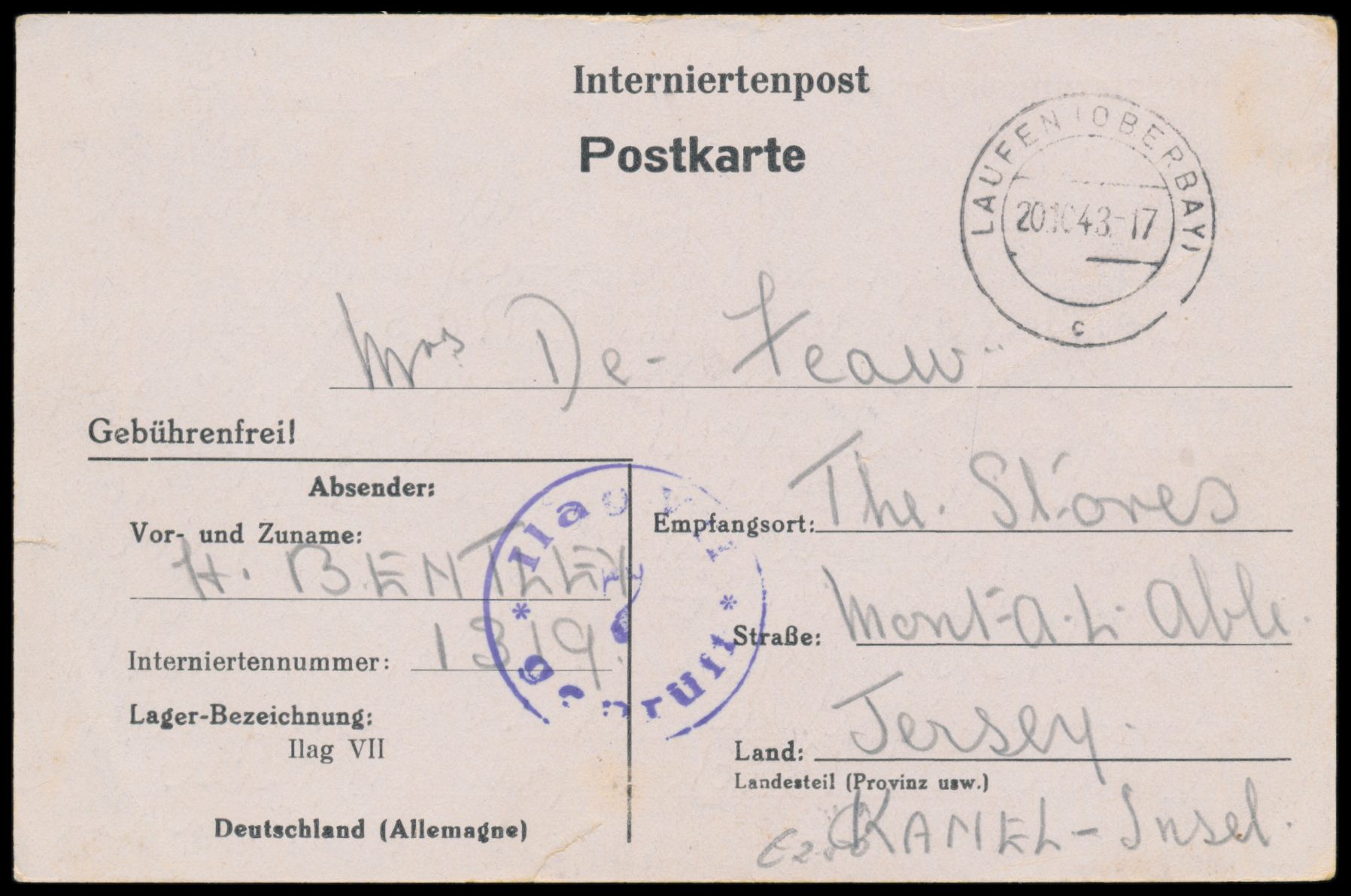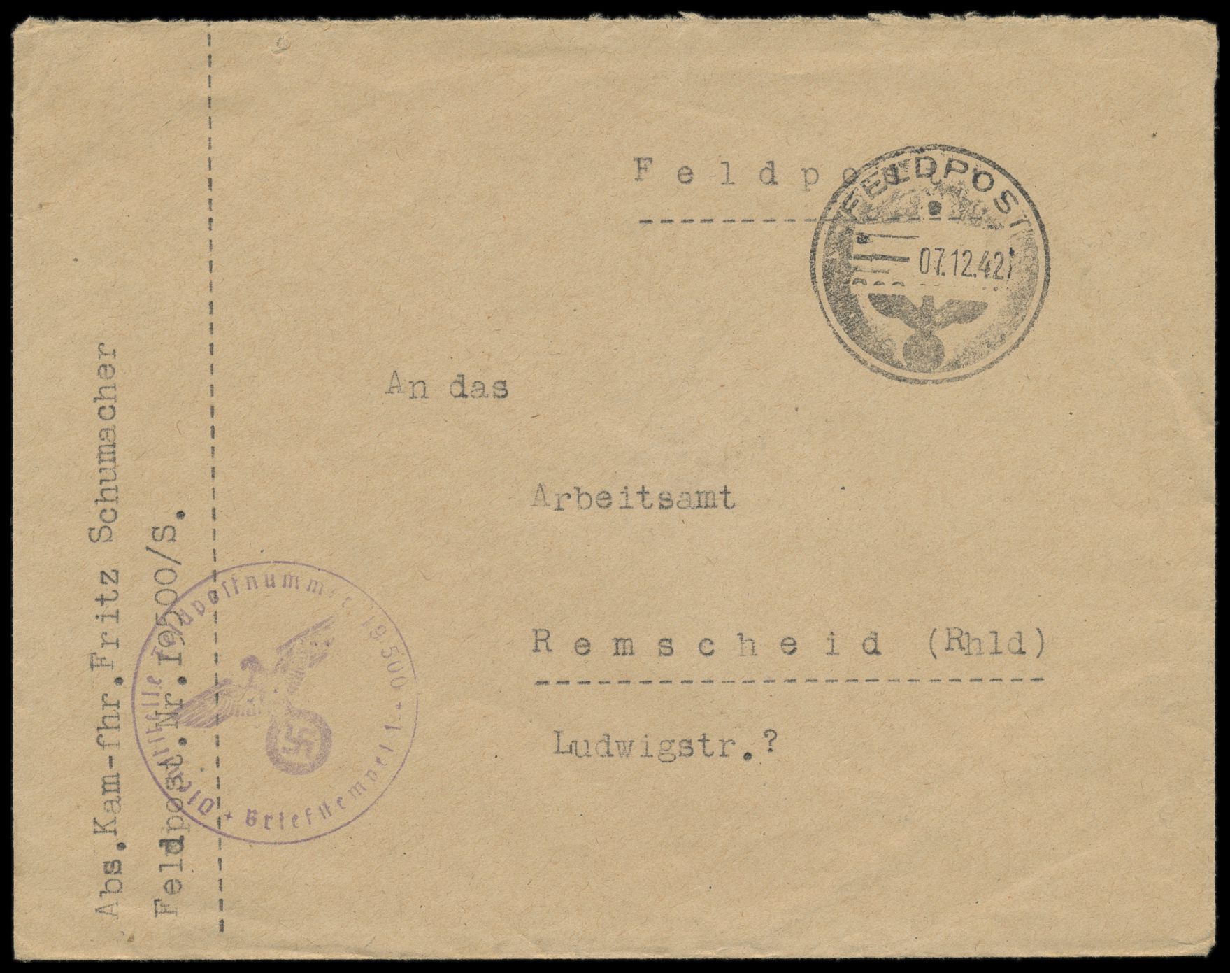 Feldpostbrief mit FPSt 7.12.42 nach Remscheid, vorderseitig Absenderangabe ... FPNr. 19500/S und Briefstempel Dienststelle Feldpostnummer 19500 = OT-Abschnitts-Bauleitung Adolf auf Alderney, Post von Einheiten der Organisation Todt auf den Kanalinseln ist selten, MiPr. 600