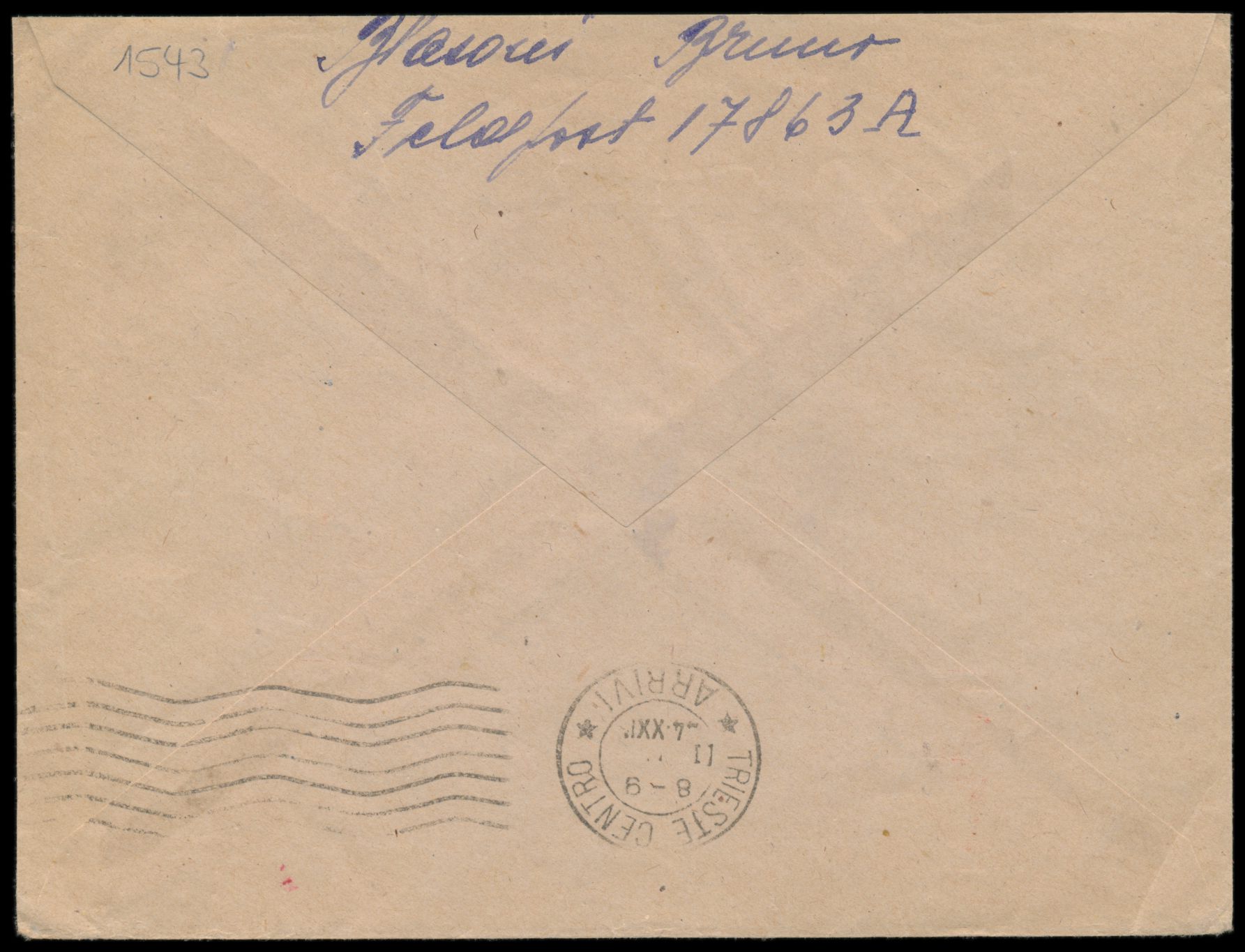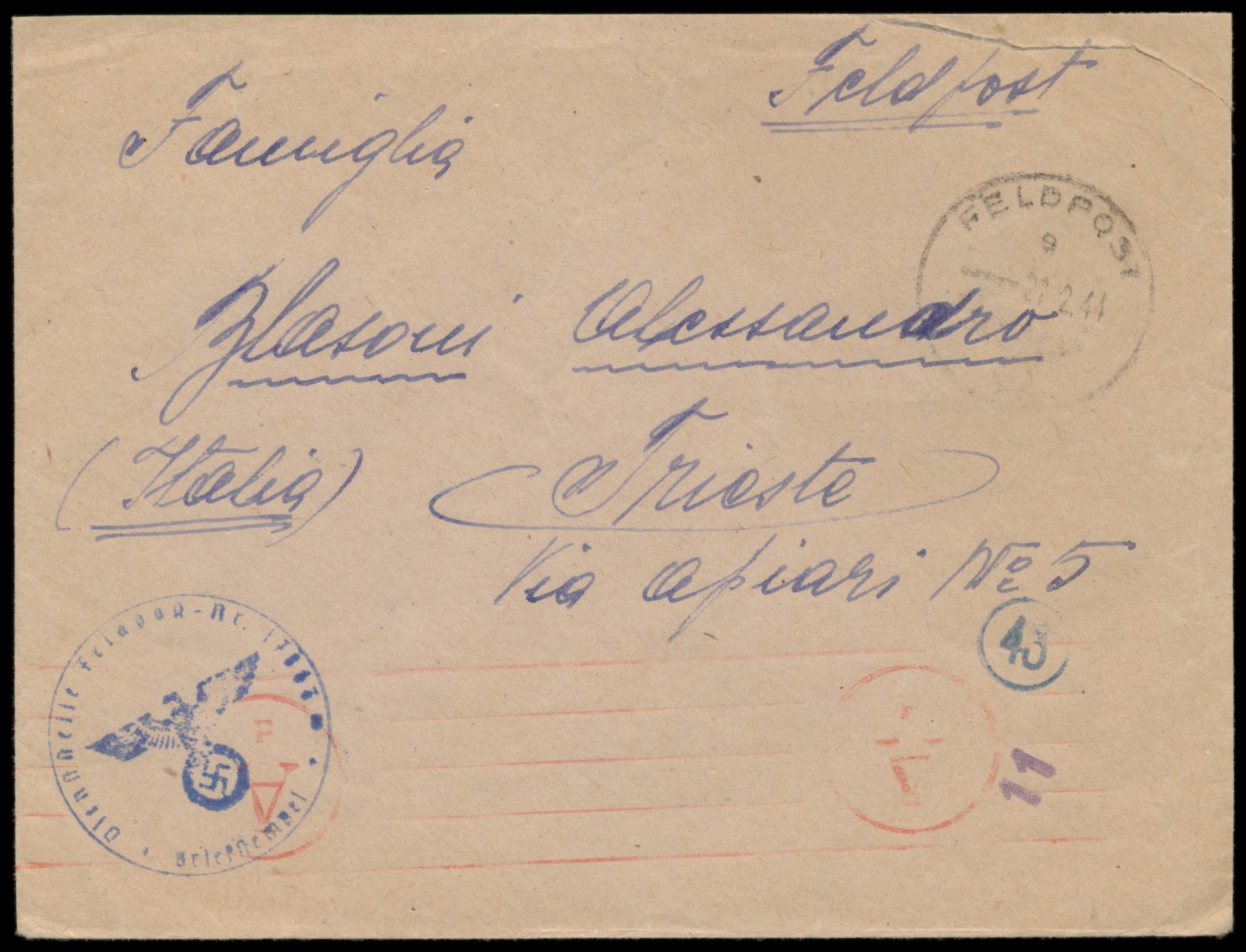 Feldpostbrief eines Italieners in der Wehrmacht nach Italien, Feldpoststempel UB e 21.2.44, handschriftlicher Absender und Briefstempel ... FPNr. 17863 A = Stab IV Artillerie-Regiment 319 auf Guernsey, Durchlaufstempel der Zensurstelle München, Ankunftsstempel Trieste, oben rechts kleiner Öffnungsriss mit Falz hinterlegt