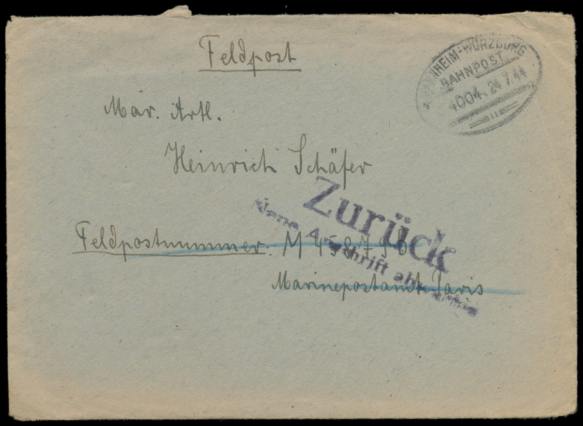 Feldpostbrief aus Klein-Eicholzheim bei Aschaffenburg mit Bahnpoststempel Mannheim - Würzburg 24.7.44 an FPNr. M 45879 B, Marinepostamt Paris = 1. Batterie Marine-Artillerie-Abteilung 605 auf Alderney, Postverkehr wegen der Landung der Alliierten in der Normandie unterbrochen, deshalb violetter L2 Zurück / Neue Anschrift abwarten, mit Inhalt