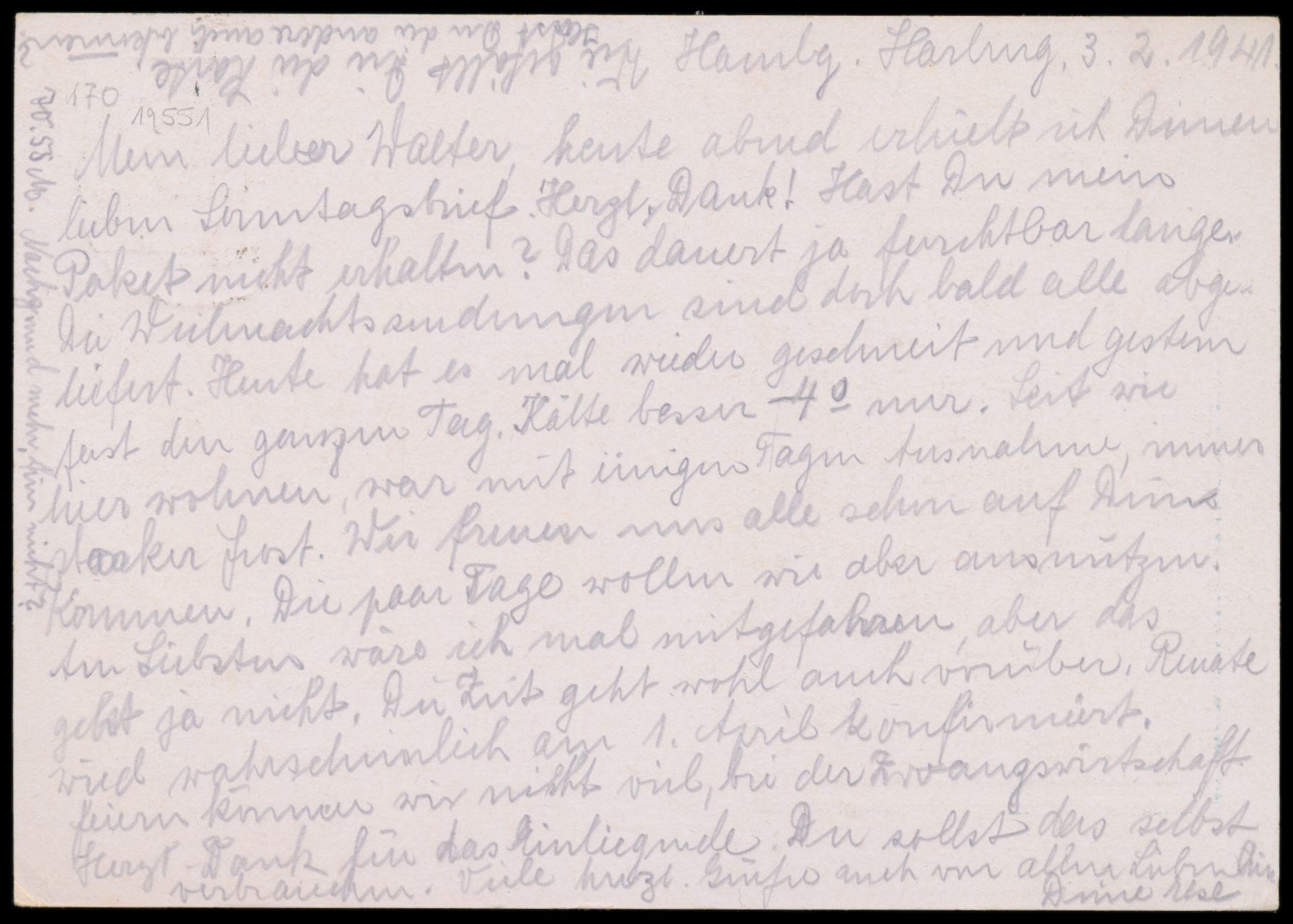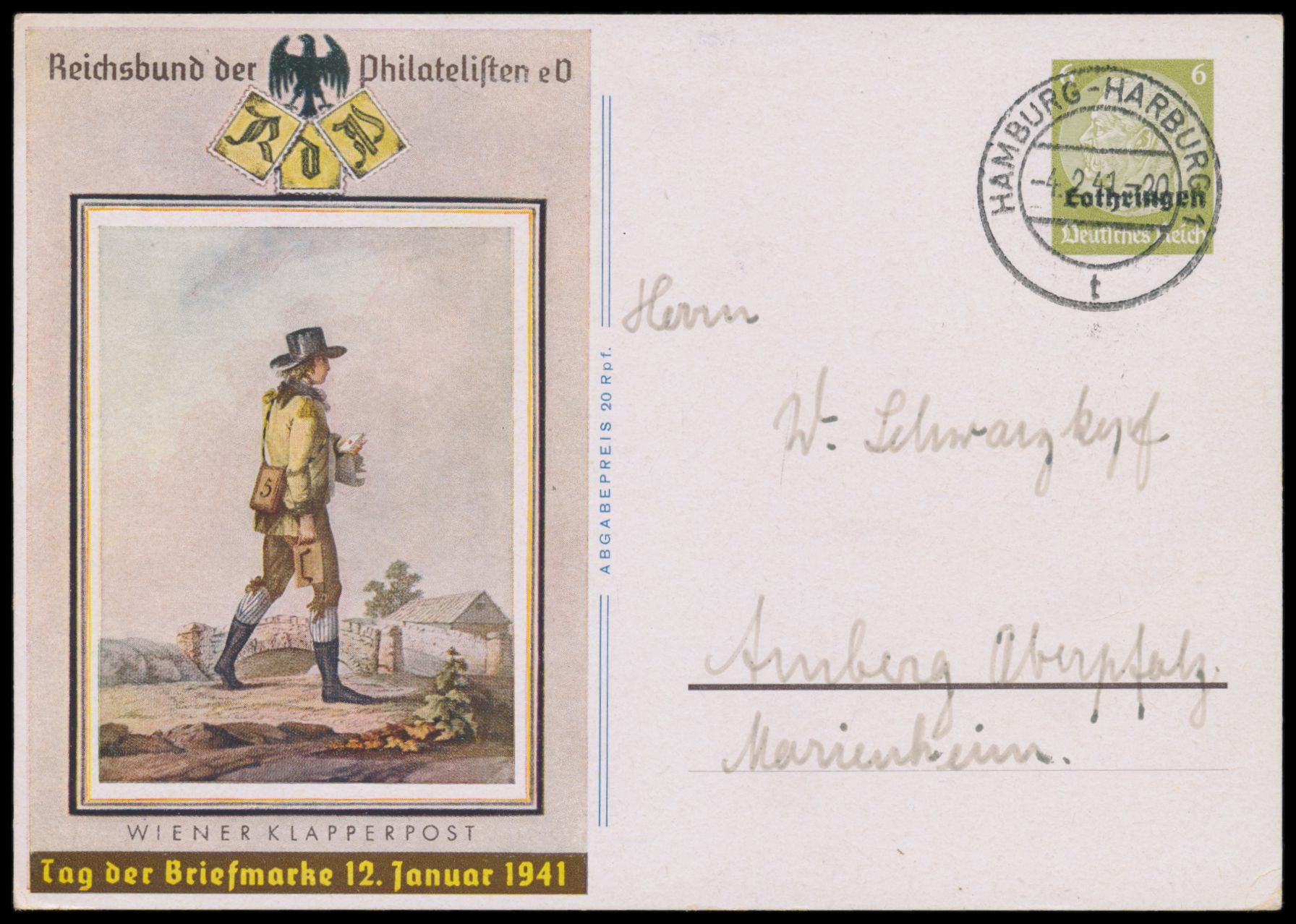 Ganzsache 6 Pf. Tag der Briefmarke mit Stempel Hamburg-Harburg 1 4.2.41 nach Amberg, langer Bedarfstext, MiPr. -.-