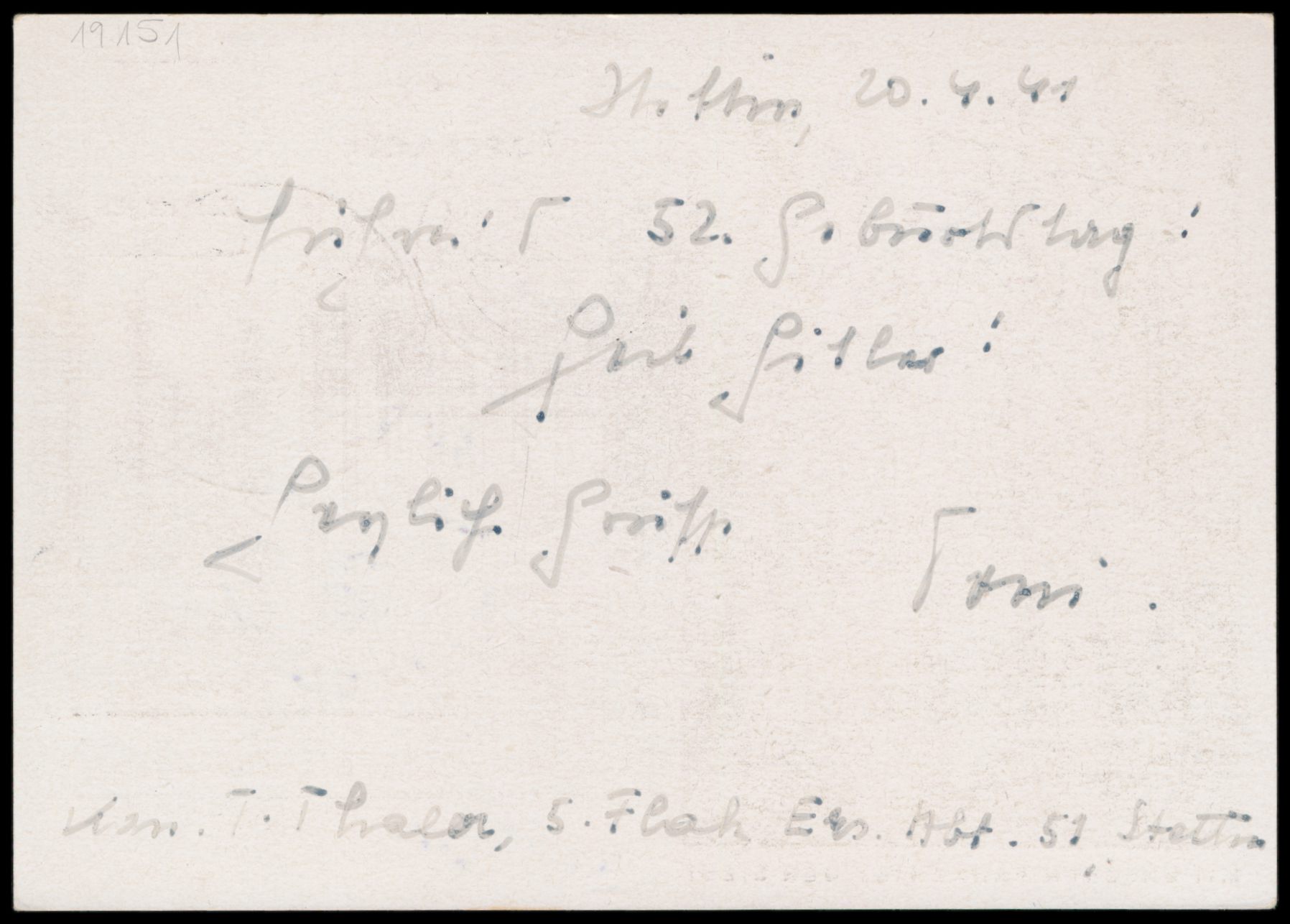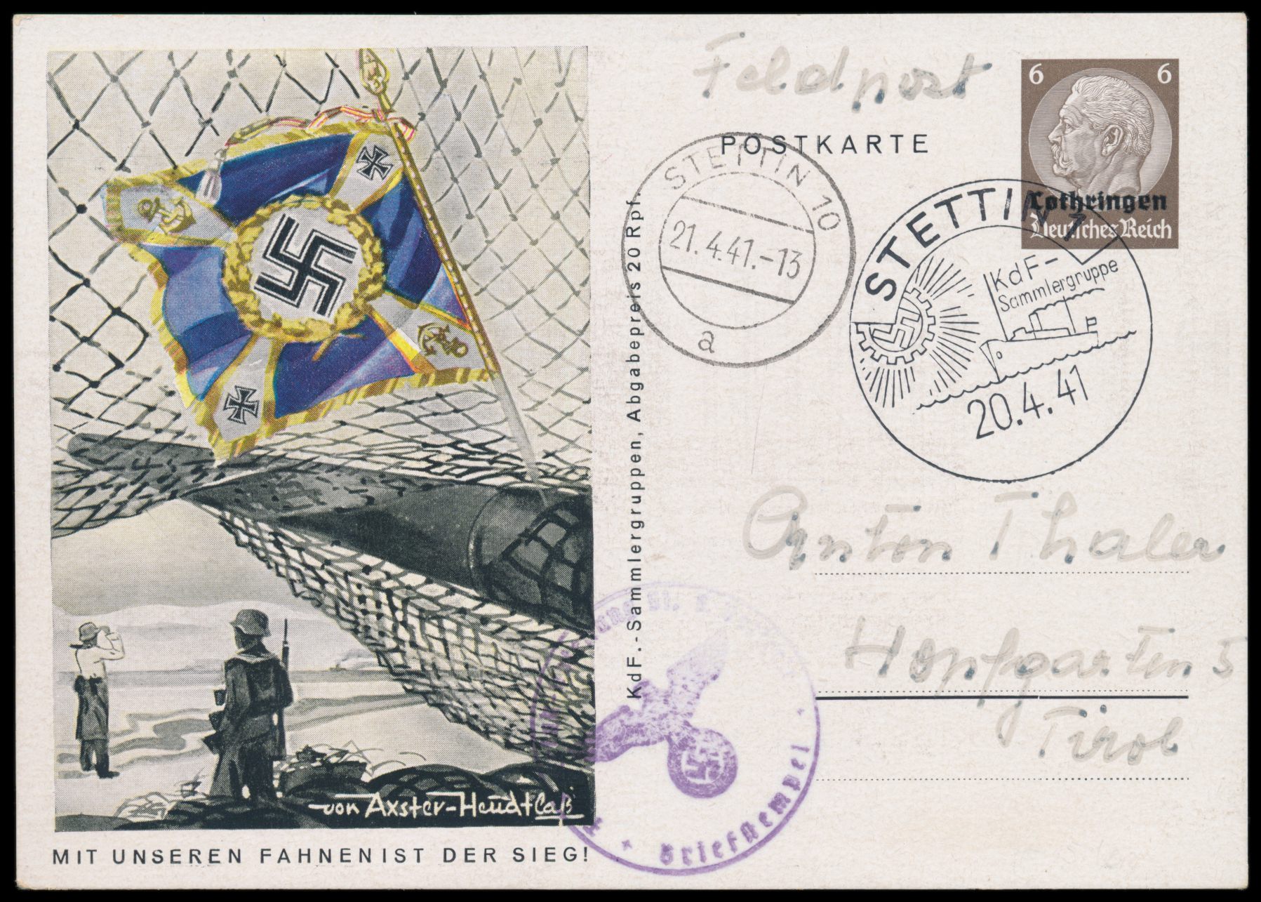 Ganzsache 6 Pf. "Mit unseren Fahnen ...", Bild Marine-Artillerie, Sonderstempel Stettin 1 20.4.41 und Tagesstempel Stettin 10 21.4.41, Briefstempel Flak-Ersatz-Abteilung 51, als Feldpostkarte nach Hopfgarten, Grußtext
