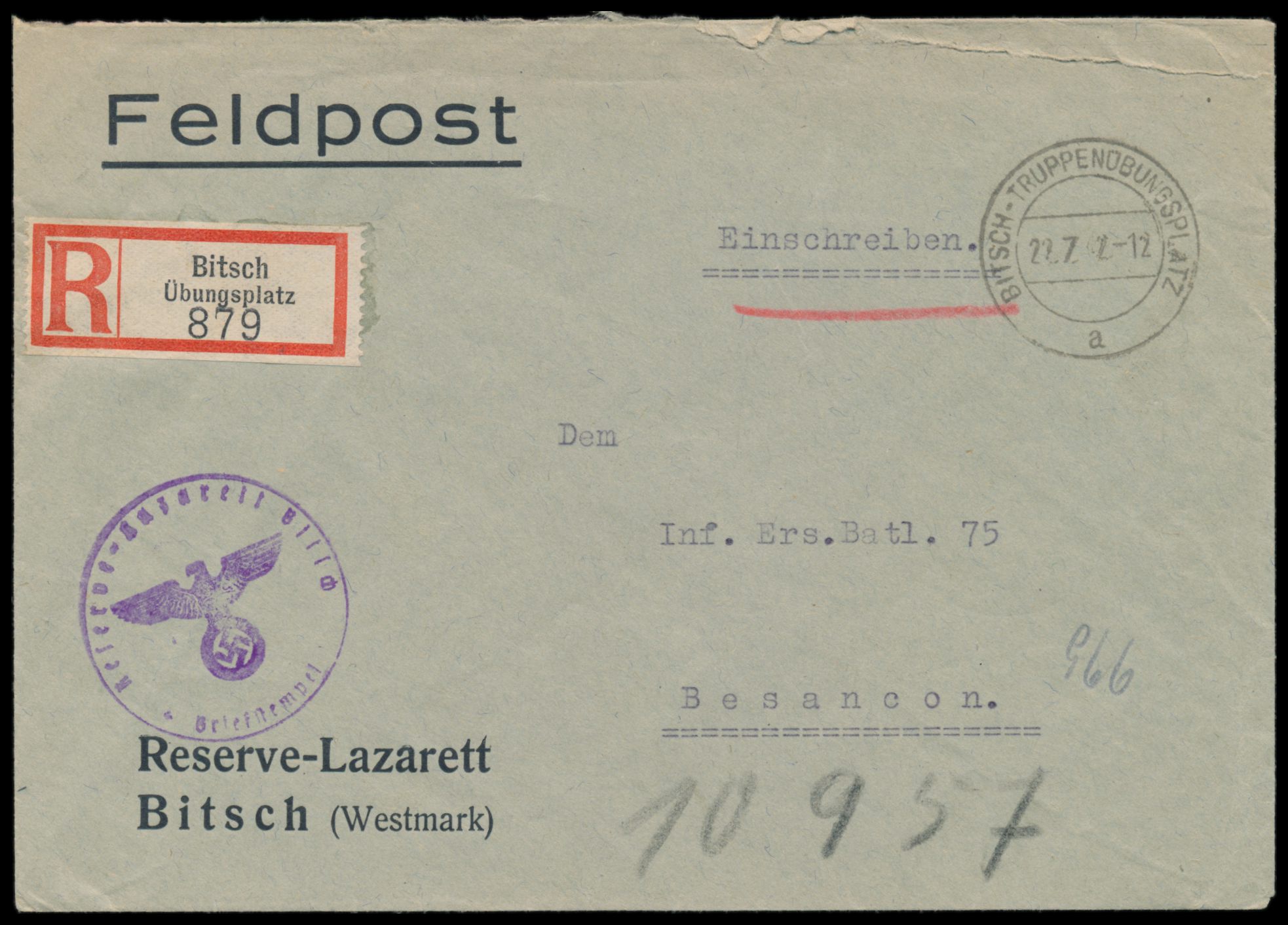 Stempel Bitsch-Truppenübungsplatz 22.7.42 auf Dienst-R-Brief des Reserve-lazarett Bitsch an das Inf. Ers. Batl. 75 in Besancon mit ergänzter FPNr. 10957, R-Zettel Bitsch / Übungsplatz, oben kleiner Öffnungsriss