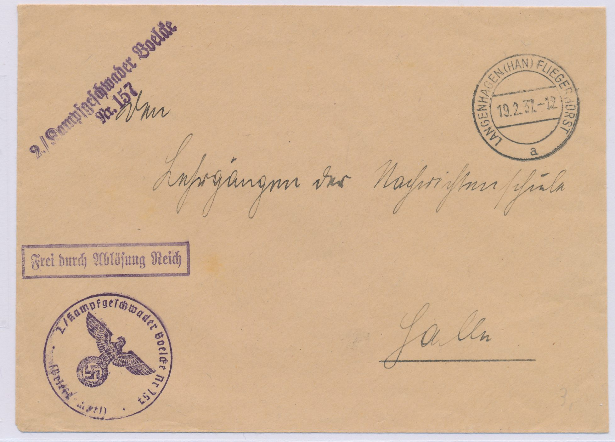 Brief mit Stempel 2, Kampfgeschwader Boelcke Nr. 157, Formular- und Dienstsiegel, Frei durch Ablösung, Stempel Langenhagen (Han) Fliegerhorst 19.2.37, Bedarf nach Halle, Geschwader wurde erst im April 1937 aufgestellt