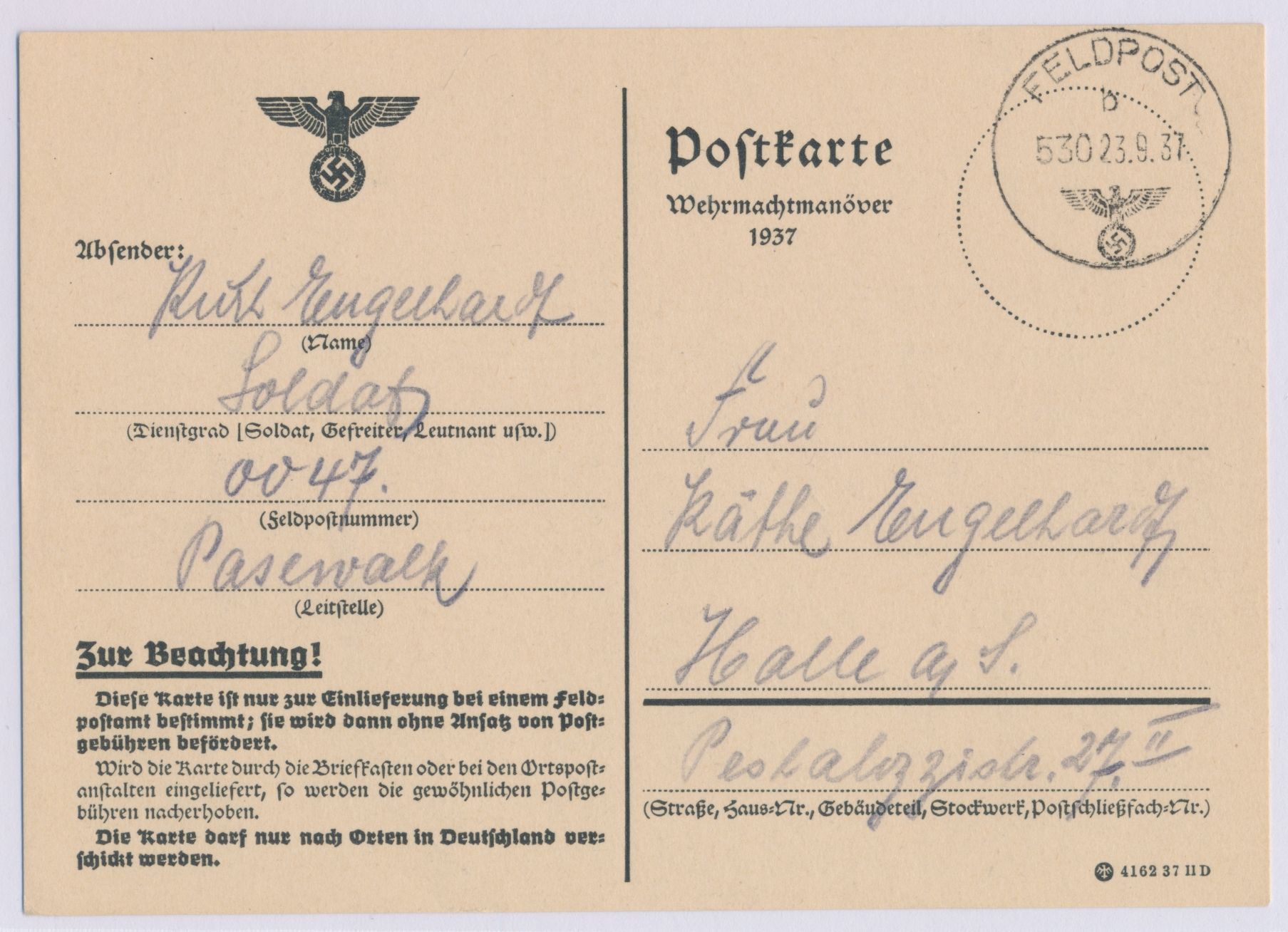 Wehrmachtmanöver 1937, Feldpoststempel mit UB b und taktischer Nr. 530 23.9.37 auf Manöver-Vordruckarte 4162 37 II D nach Halle, Absender Feldpostnummer 0047, Leitstelle Pasewalk, Bedarf