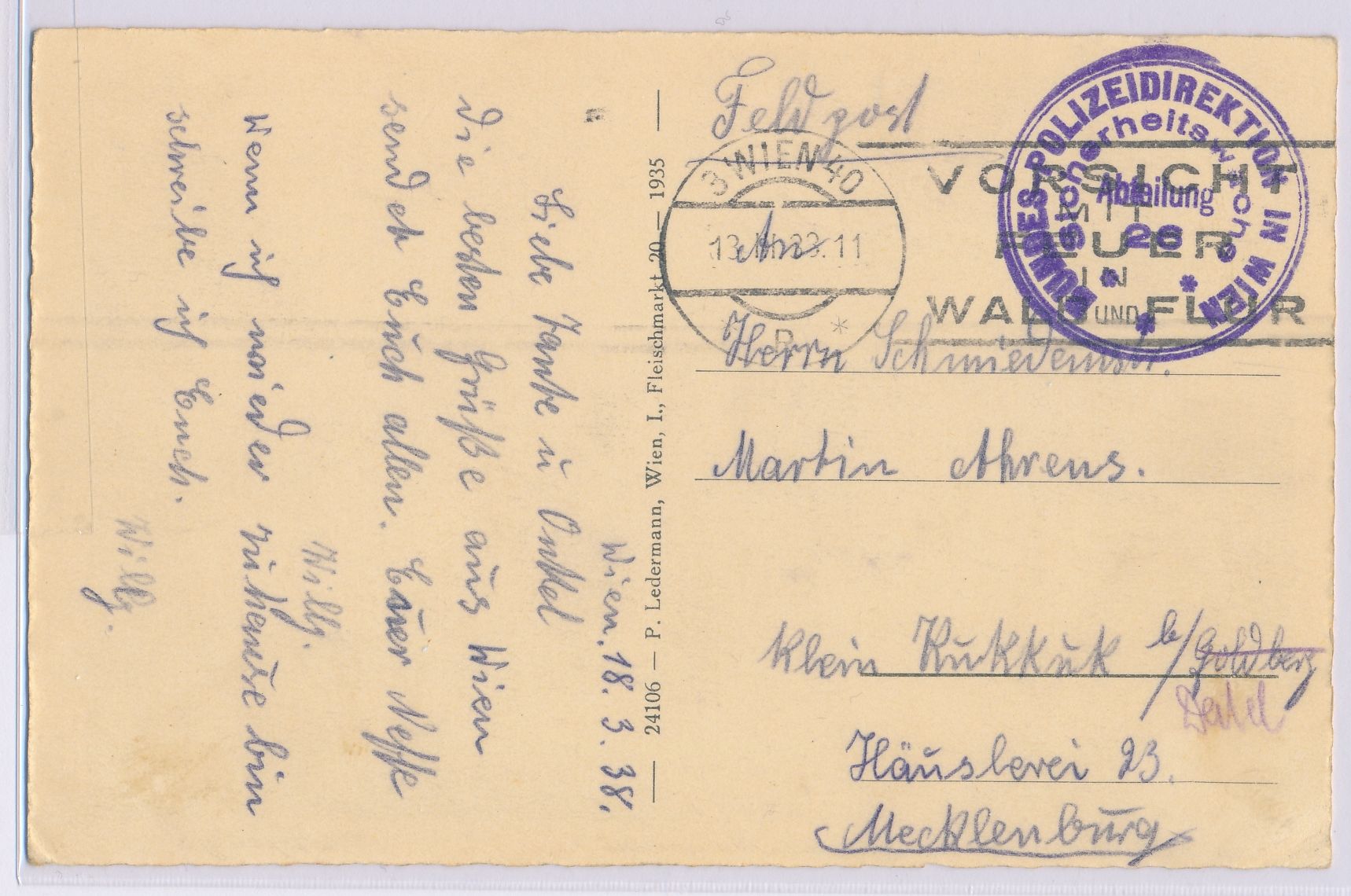 Österreich 1938, Ansichtskarte mit Briefstempel "Bundes-Polizeidirektion in Wien / Sicherheitswache / Abteilung 26" und Maschinenstempel 3 Wien 40 18.3.38, nach Klein Kukkuk / Mecklenburg