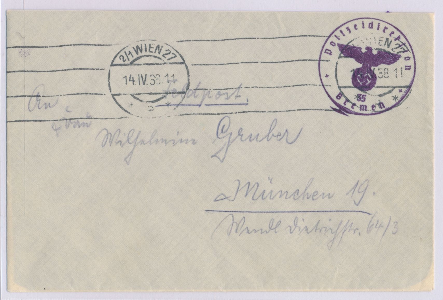 Österreich 1938, Feldpostbrief mit Briefstempel "Polizeipräsident in Wiesbaden" und Maschinenstempel Wien 27 14.4.38 nach München, handschriftlicher Absender "... 6. Hundertschaft", Bedarf