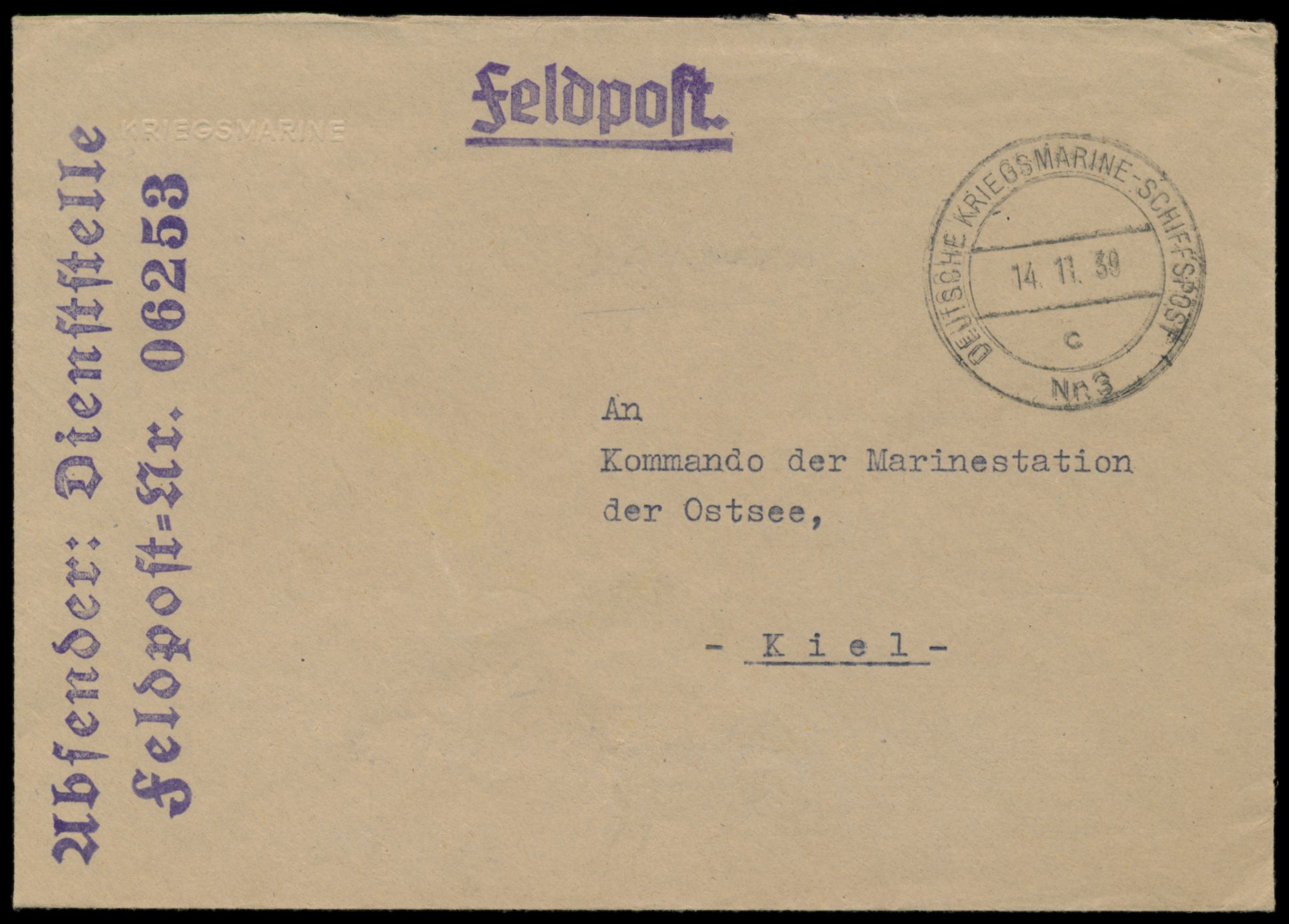 Stempel Deutsche Kriegsmarine-Schiffspost Nr. 3 c 14.11.39 auf Feldpost-Dienstbrief nach Kiel, Absenderstempel Dienststelle FPNr. 06253 = 5. Torpedoboots-Flottille u. Kommando auf Boot "Greif"