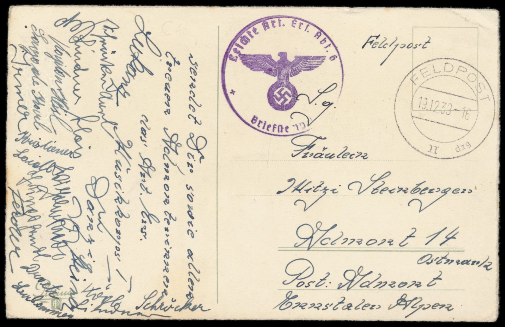 Stempel Feldpost II dzg 19.12.39 auf Feldpostkarte nach Admont, Briefstempel "Leichte Art. Ers. Abt. 6", Bedarf