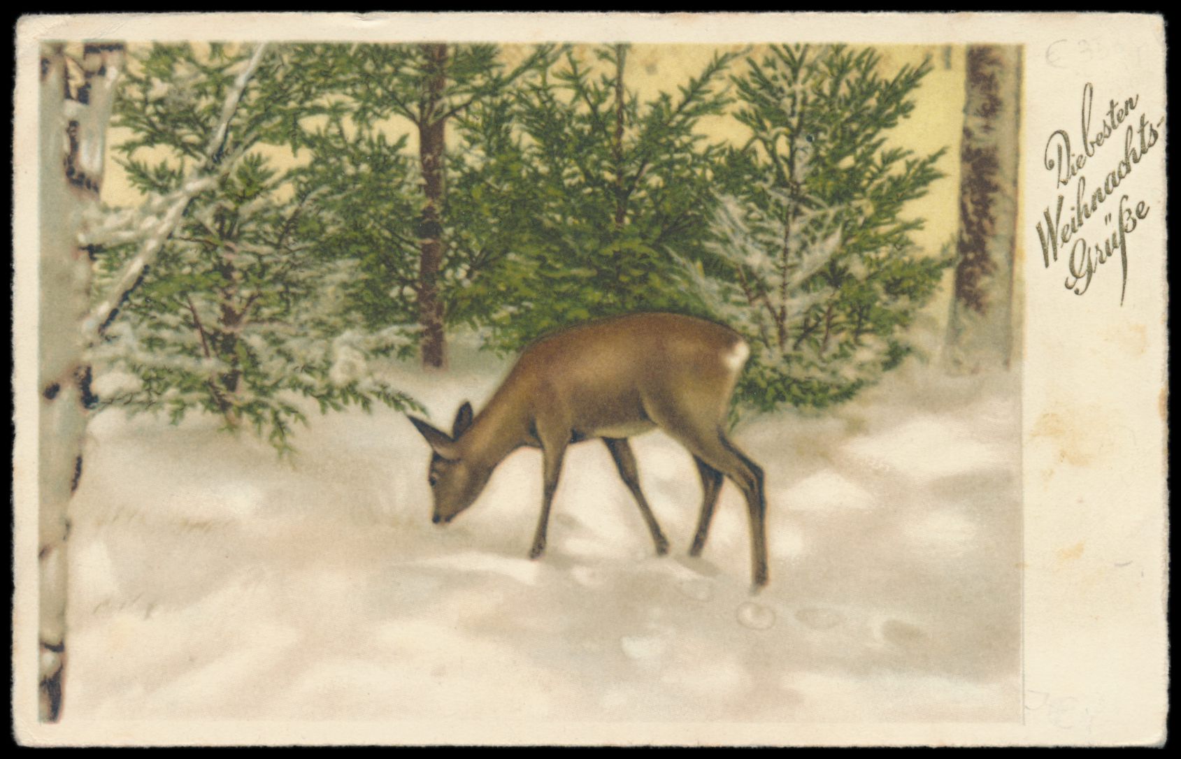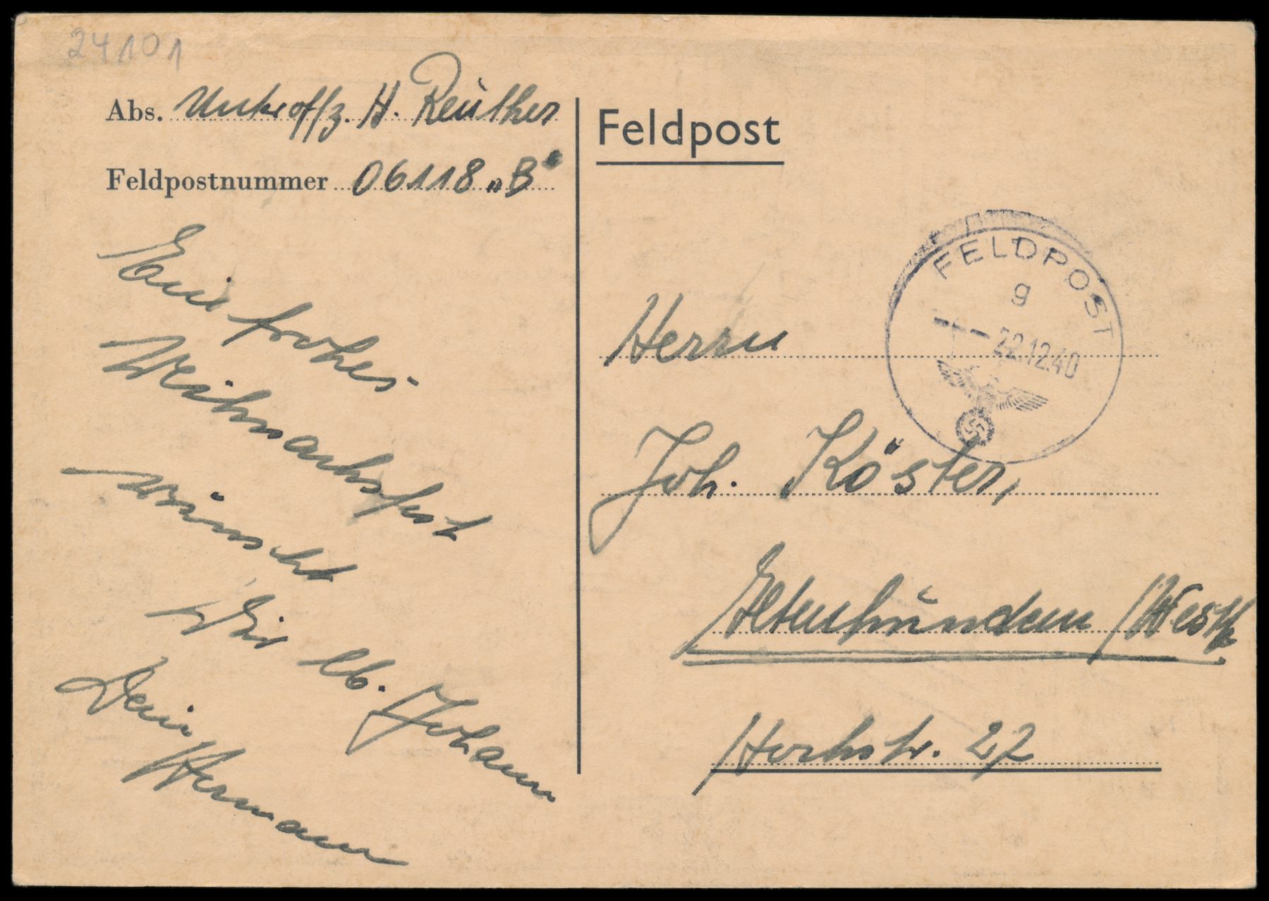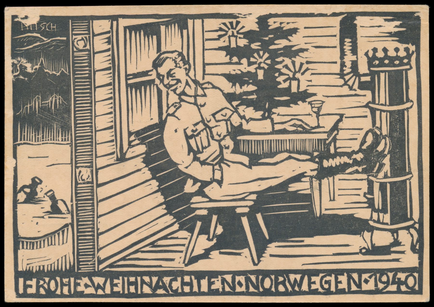Feldpostbildkarte "Frohe Weihnachten - Norwegen - 1940" (Holzschnitt-Abbildung: Soldat in Hütte mit Weihnachtsbaum), bildseitig links oben und links mittig kleine Schürfstellen, Absender FPNr. 06118 B = 5. Kompanie Infanterie-Regiment 340, Feldpoststempel 22.12.40, nach Altenhundem