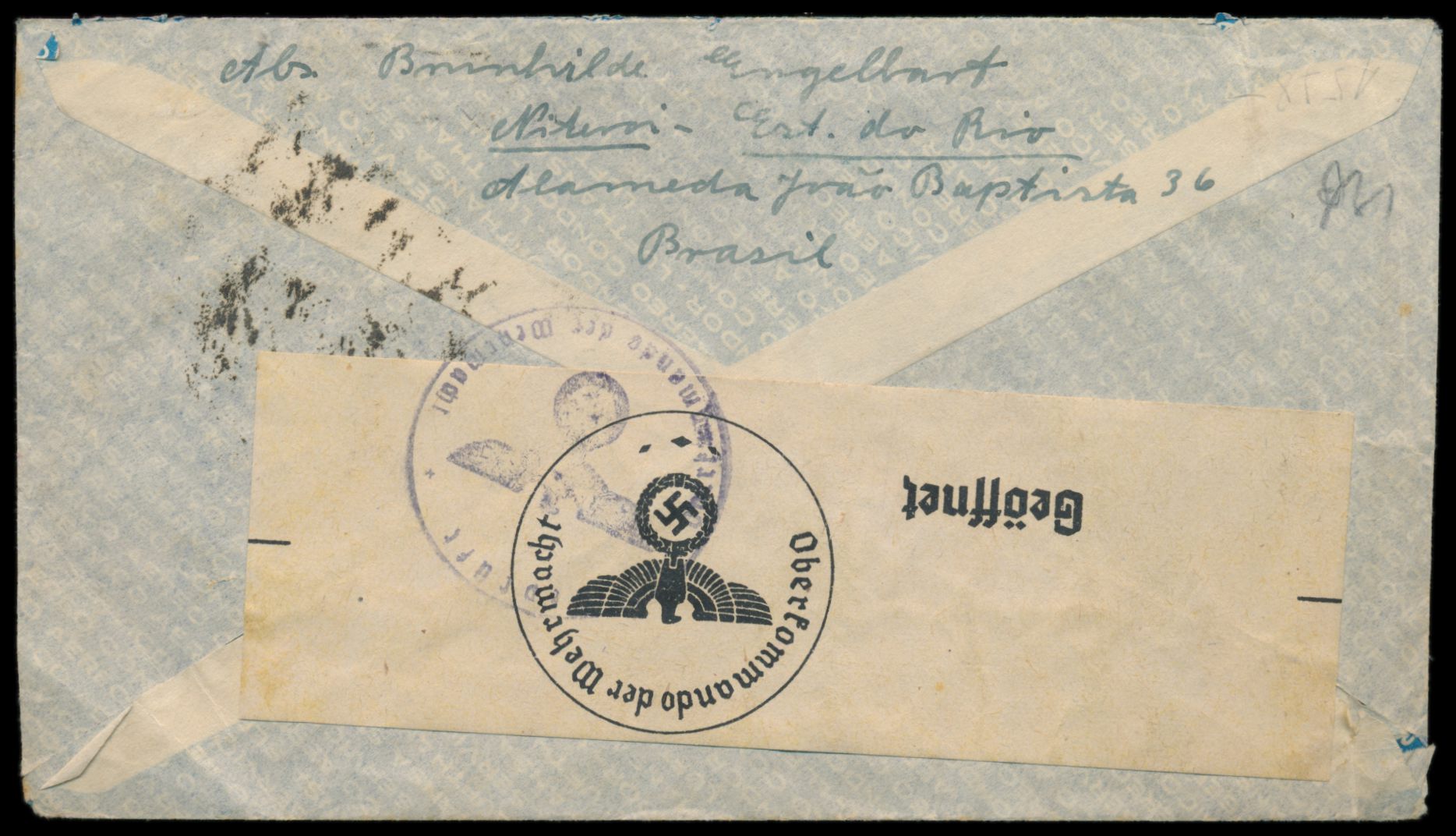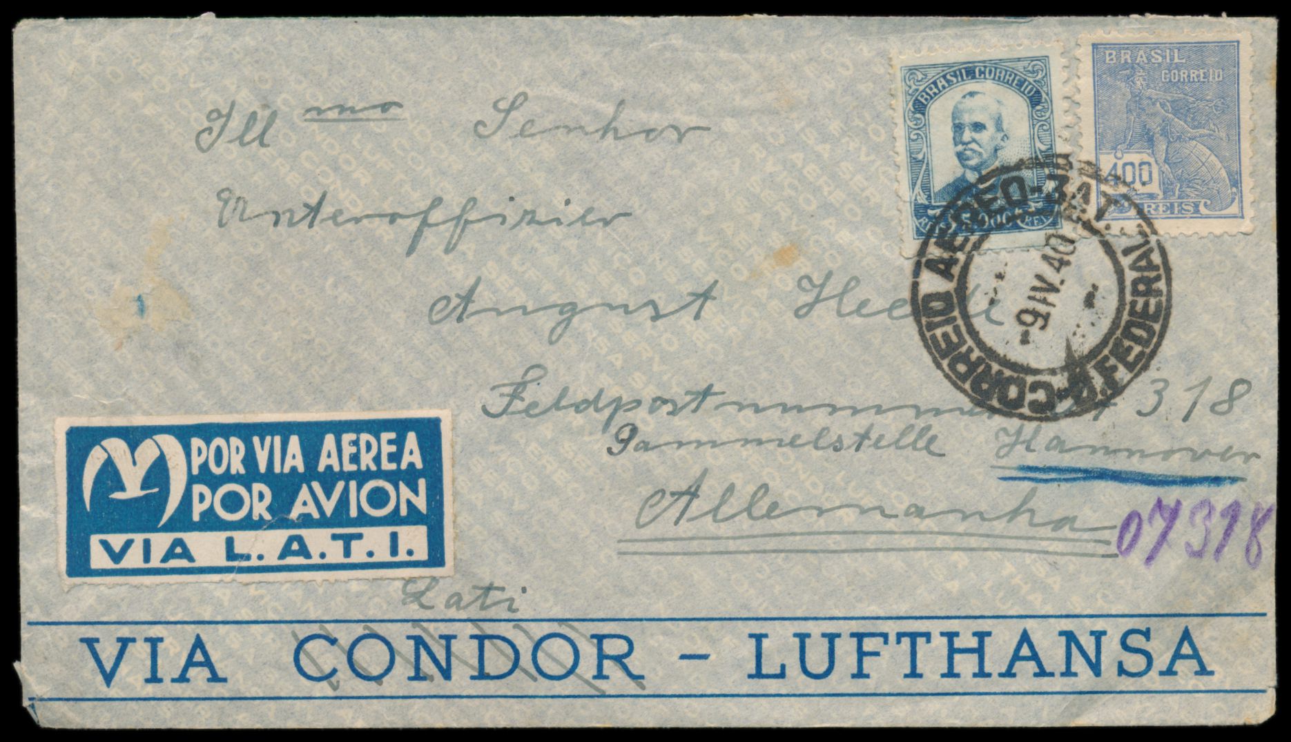 Brasilien 400 Reis und 5000 Reis auf Luftpostbrief mit Stempel Rio de Janeiro 9.4.40 an einen deutschen Soldaten mit Feldpostnummer 07318 = Feld-Kommandantur 579 / Feldkommandantur 750, befördert mit italienischer Luftpost (LATI) nach Europa, deutsche Eingangszensur, sehr seltenes Herkunftsland für Post an Feldpost, Bedarf